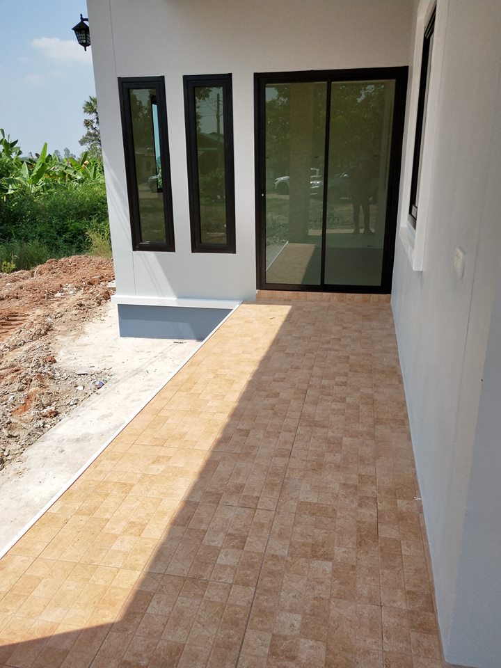 บ้านชั้นเดียว หลังคาปั้นหยา 2 ห้องนอน 1 ห้องน้ำ ผสมเทา+น้ำตาล