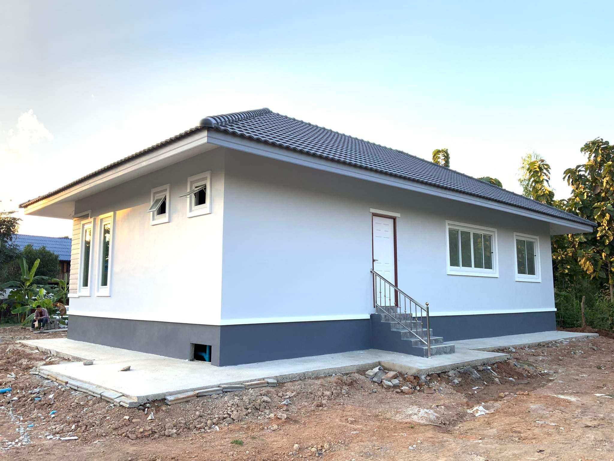 บ้านชั้นเดียว หลังคาปั้นหยา 2 ห้องนอน 1 ห้องน้ำ สีเทาฟ้า งบไม่ถึงล้าน