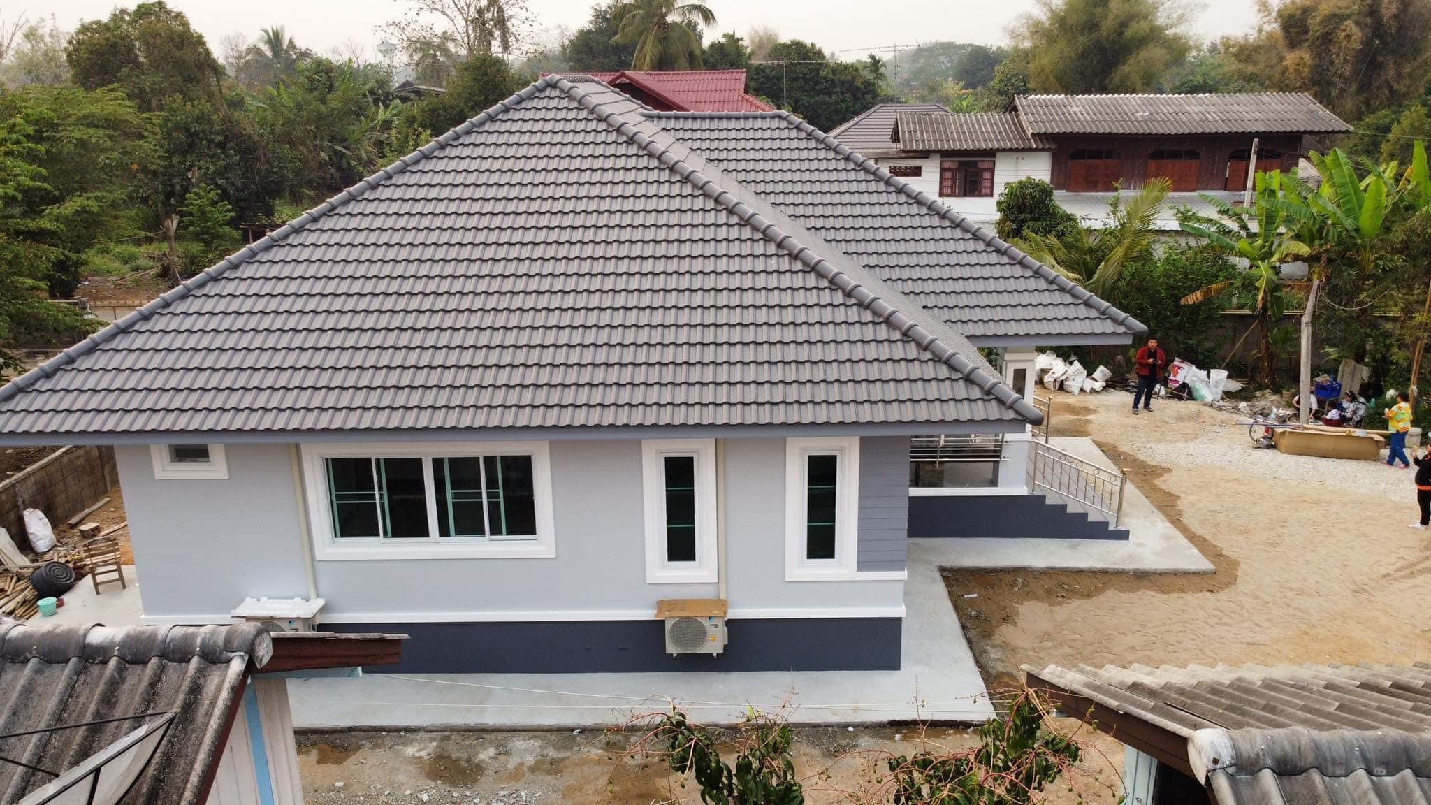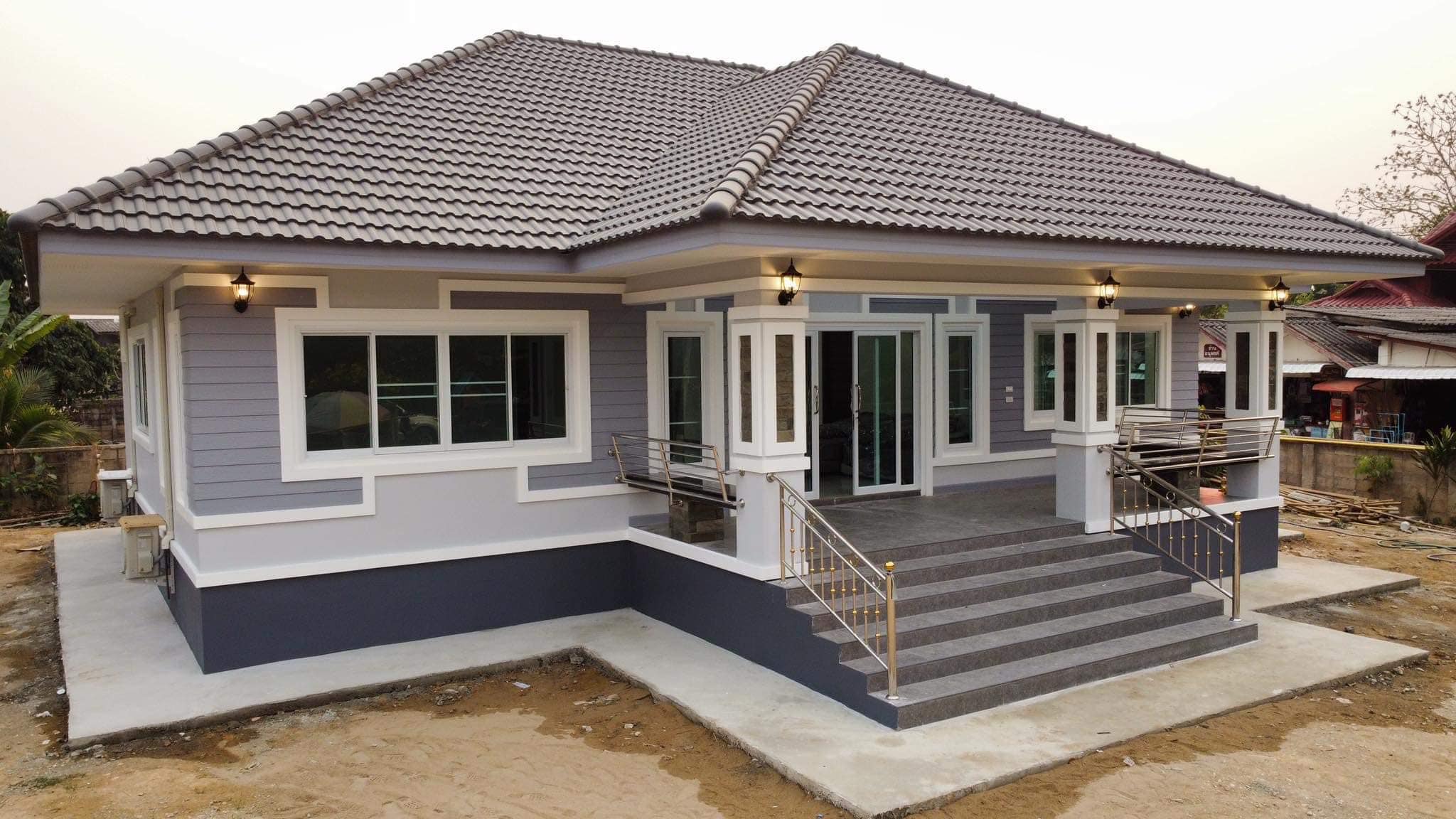 บ้านชั้นเดียว หลังคาปั้นหยา 2 ห้องนอน 1 ห้องน้ำ สีเทาฟ้า งบไม่ถึงล้าน