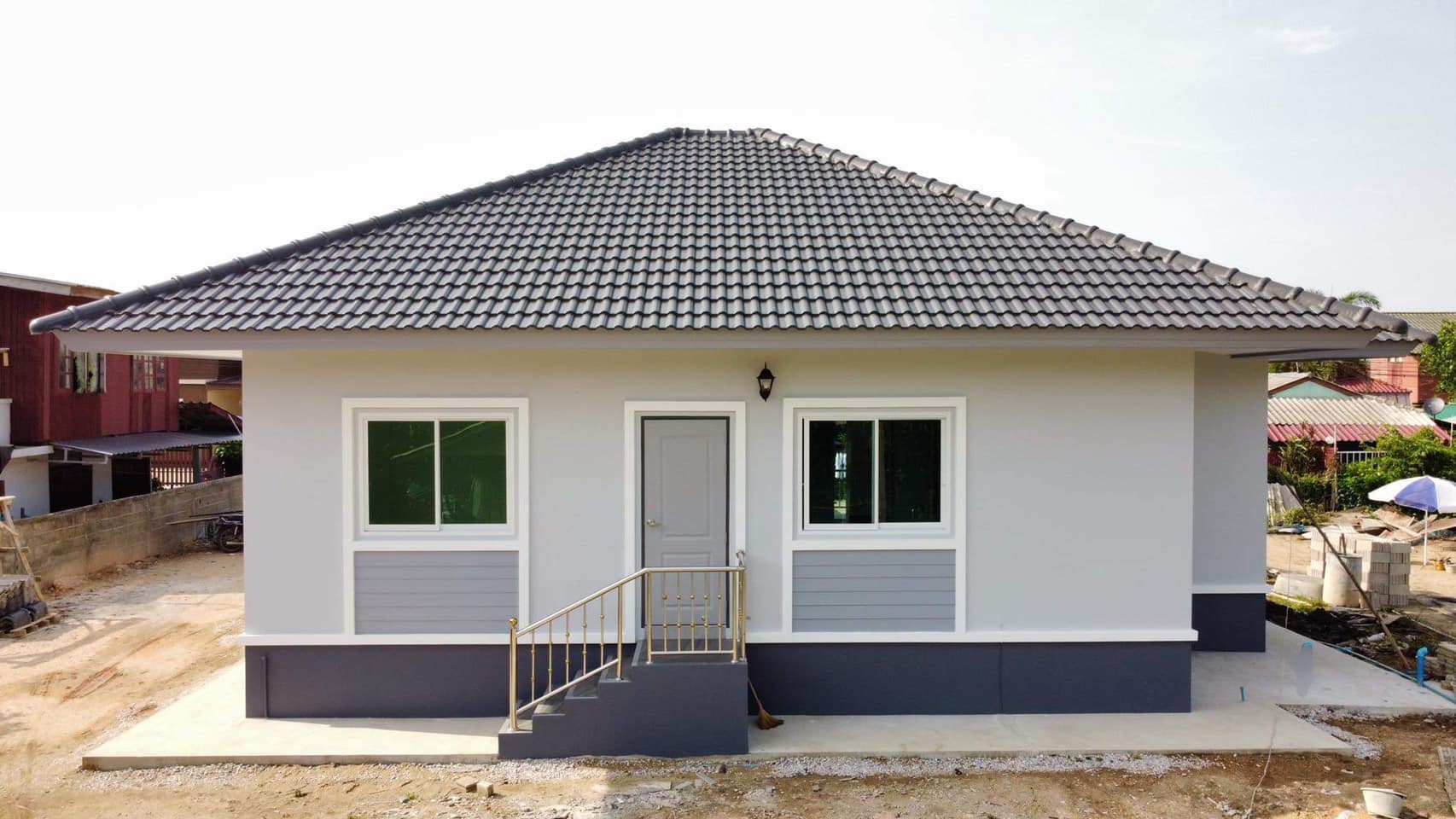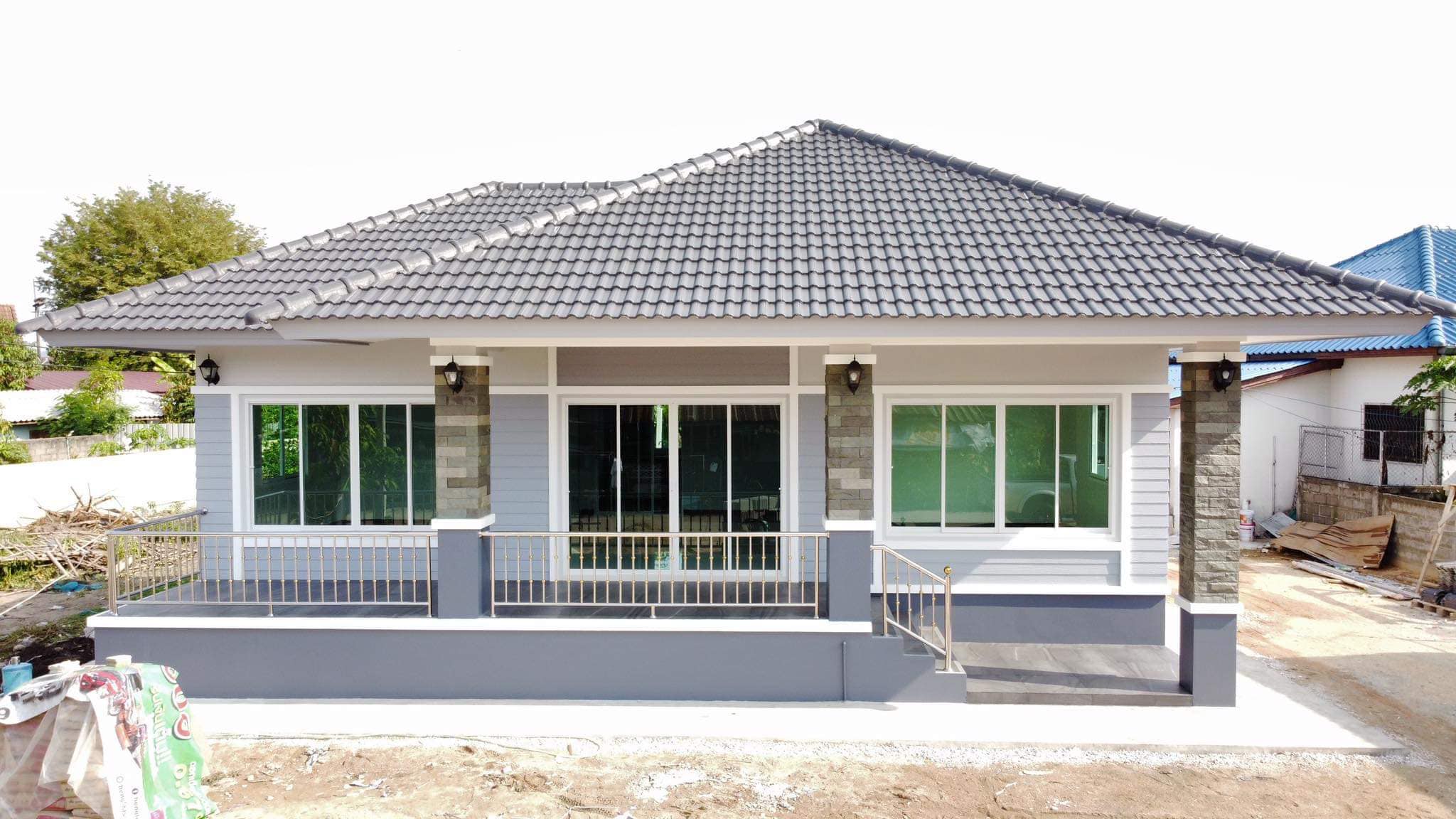 บ้านชั้นเดียว หลังคาปั้นหยา 2 ห้องนอน 1 ห้องน้ำ สีเทาฟ้า งบไม่ถึงล้าน