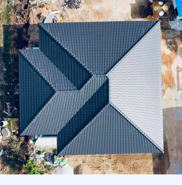 บ้านชั้นเดียว หลังคาปั้นหยา 2 ห้องนอน 1 ห้องน้ำ ผสมเทา+น้ำตาล