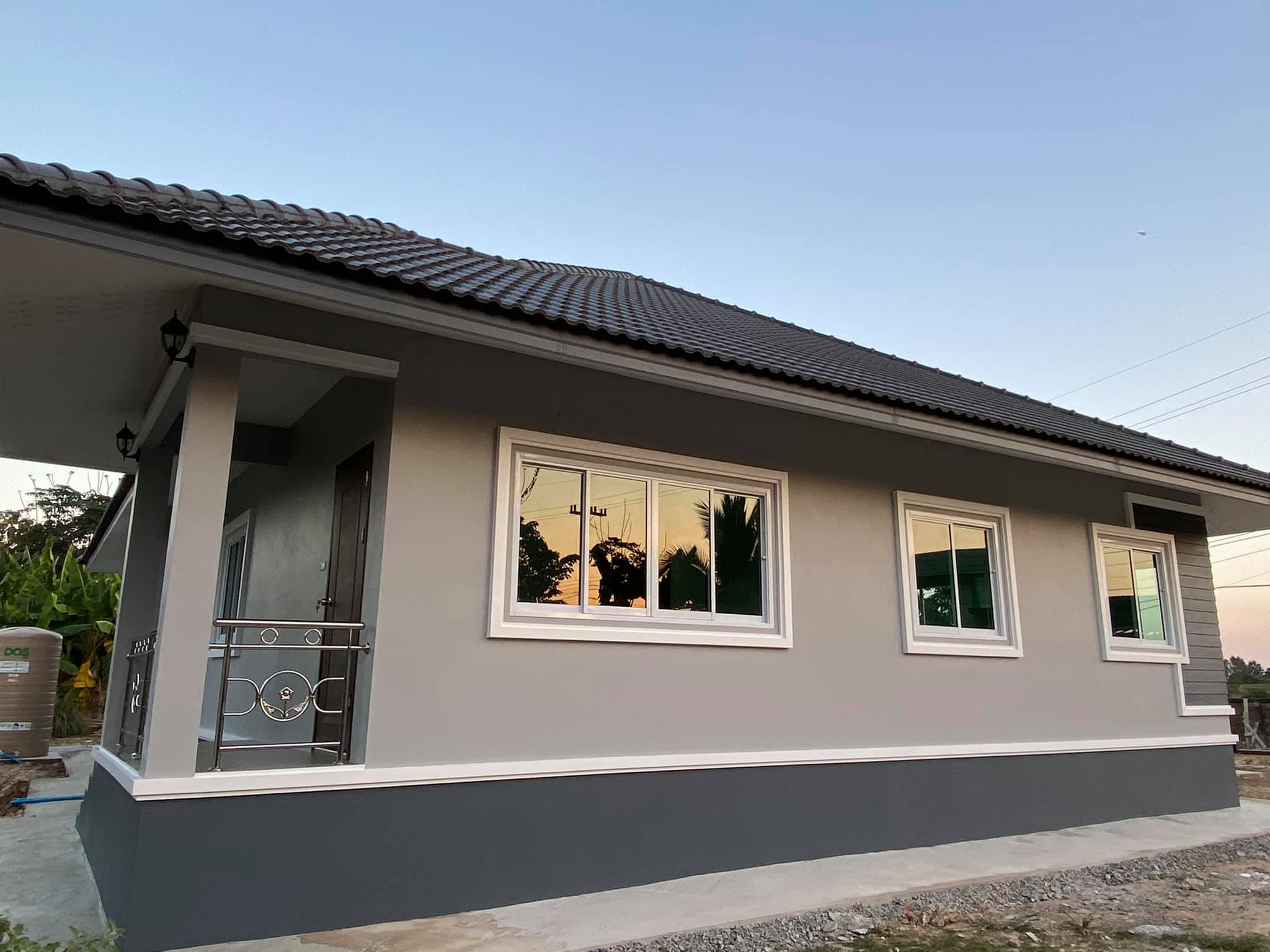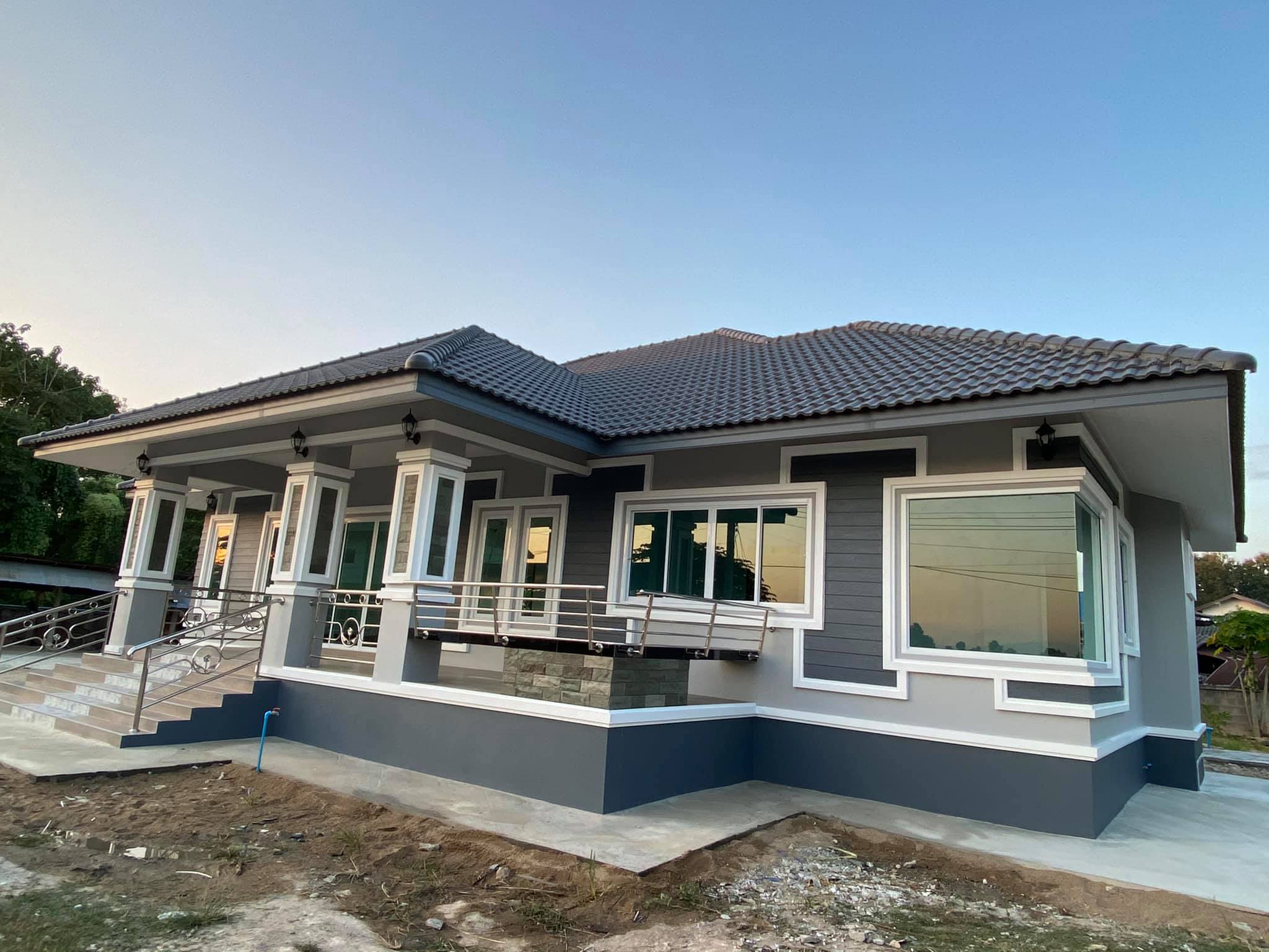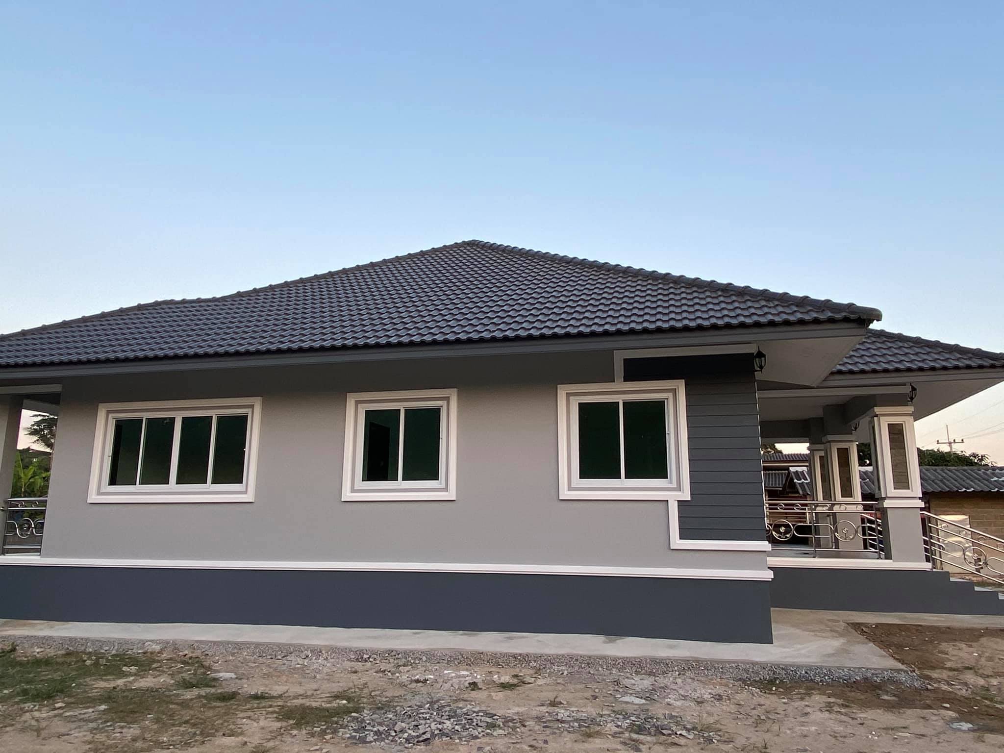 บ้านชั้นเดียว หลังคาปั้นหยา 3 ห้องนอน 2 ห้องน้ำ สีเทาสว่างๆ