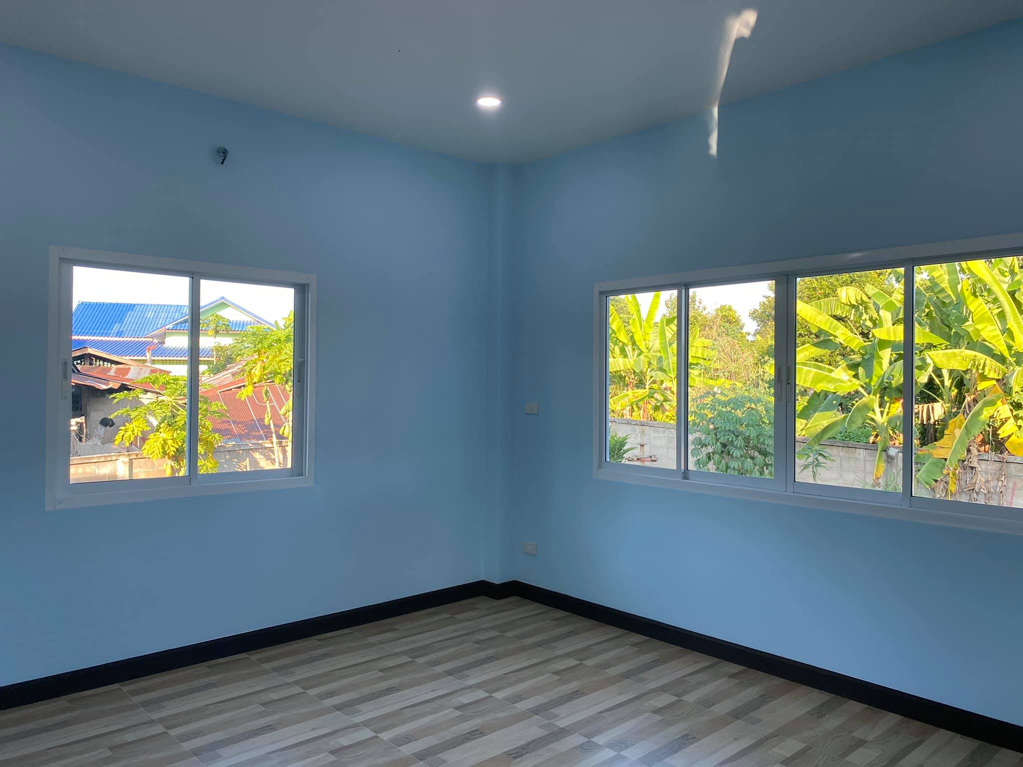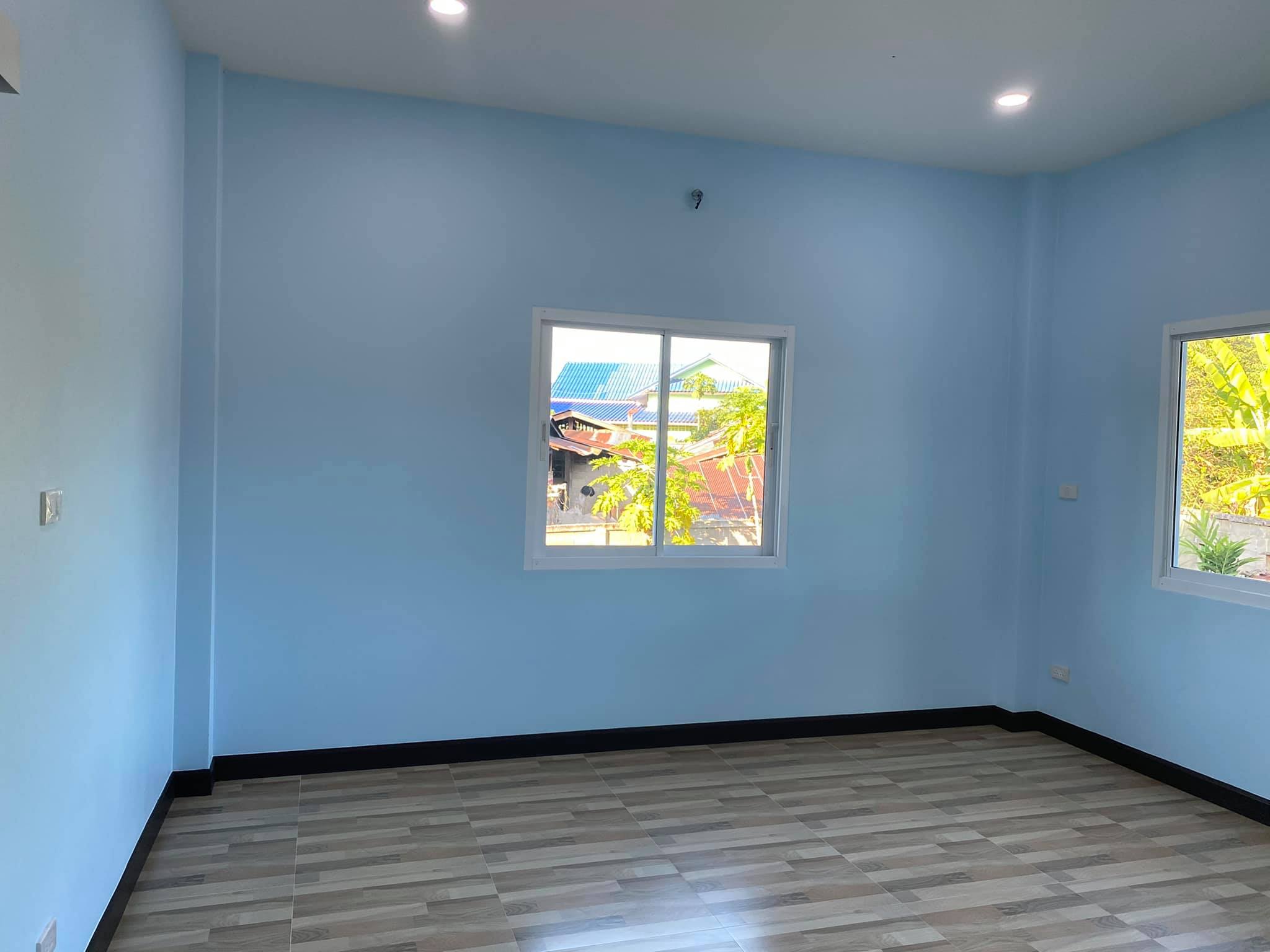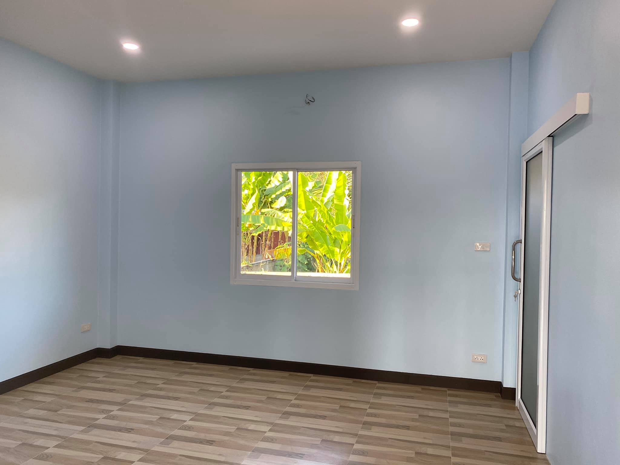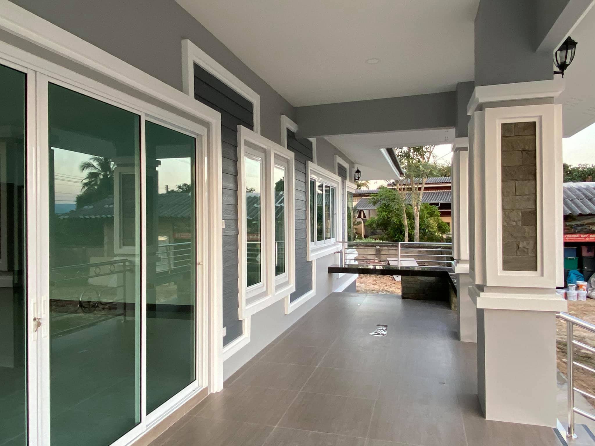 บ้านหลังนี้มาพร้อมระเบียงนั่งเล่นหน้าบ้าน ตกแต่งสีโทนสีเทา ห้องโถงสีขาวควันบุหรี่สบายตา ห้องนอนทาสี ฟ้าอ่อนสดใสตามใจเจ้าของบ้าน