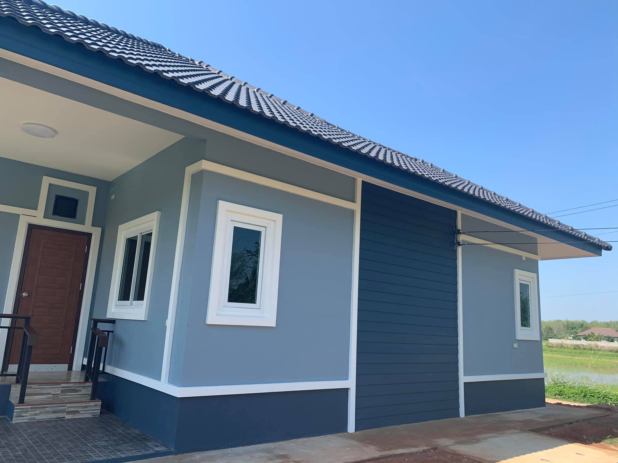บ้านชั้นเดียว หลังคาปั้นหยา 2 ห้องนอน 1 ห้องน้ำ สีเทาฟ้า งบไม่ถึงล้าน