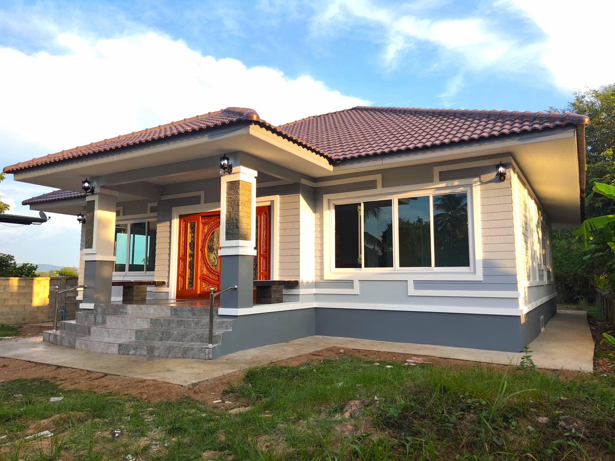 บ้านชั้นเดียว หลังคาปั้นหยา 2 ห้องนอน 1 ห้องน้ำ สีเทาฟ้า งบไม่ถึงล้าน