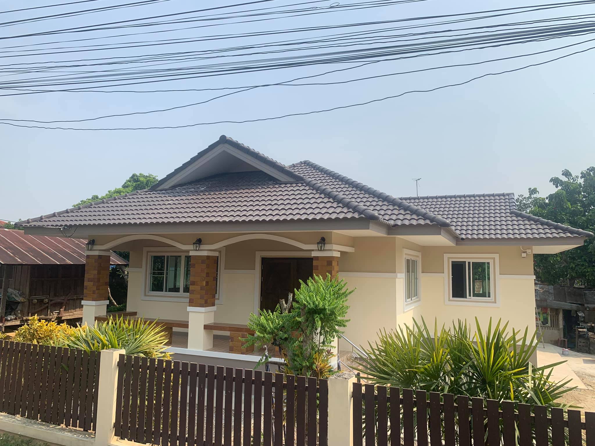 บ้านชั้นเดียว หลังคาปั้นหยา 2 ห้องนอน 1 ห้องน้ำ ผสมเทา+น้ำตาล