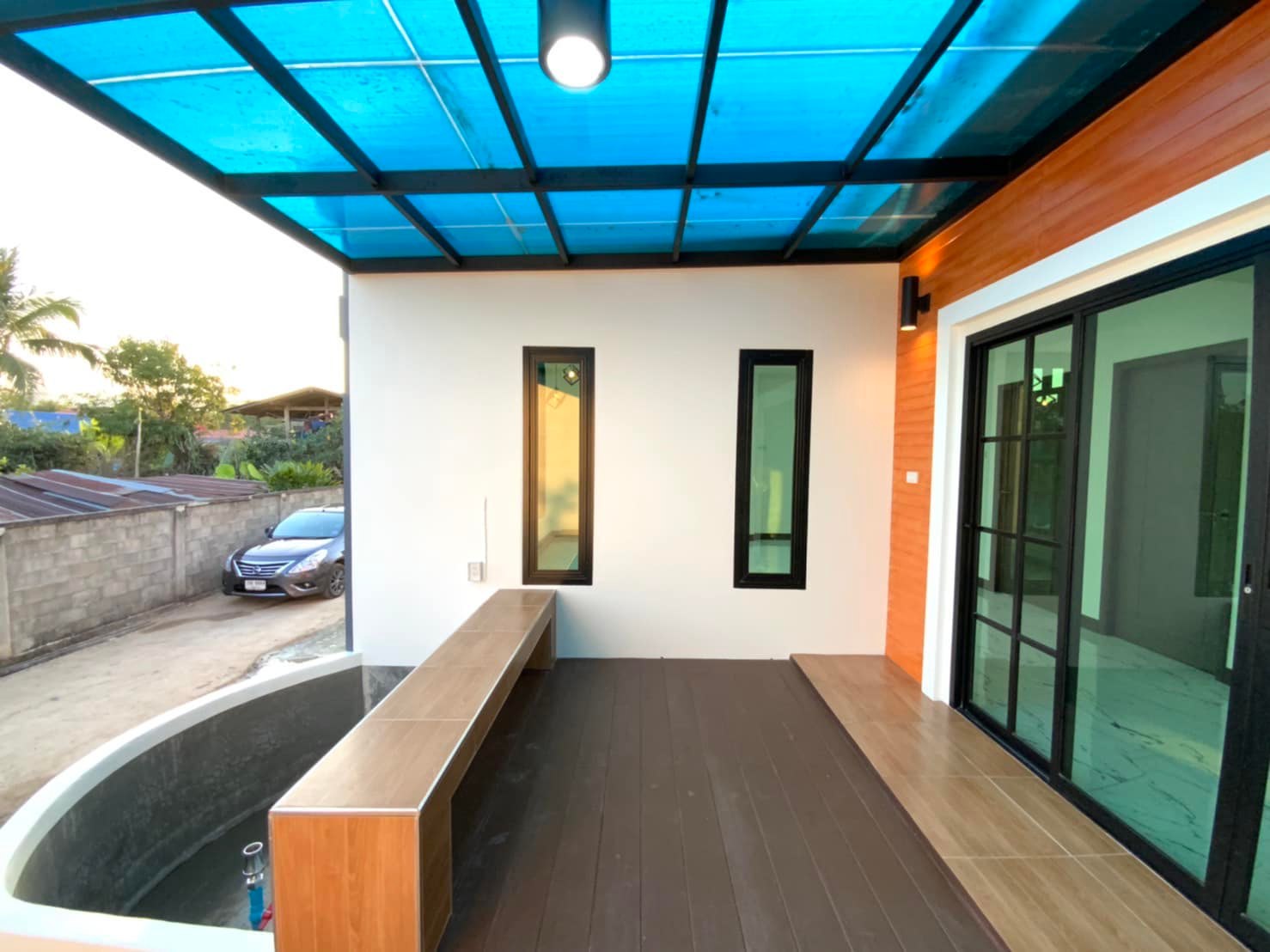 บ้านชั้นเดียว สไตล์คอนเทมโพลารี่ หลังคาทรงปั้นหยา 2 ห้องนอน 1 ห้องน้ำ ตกแต่งสีโทนสีเทากับสีฟ้า งบไม่ถึงบ้าน