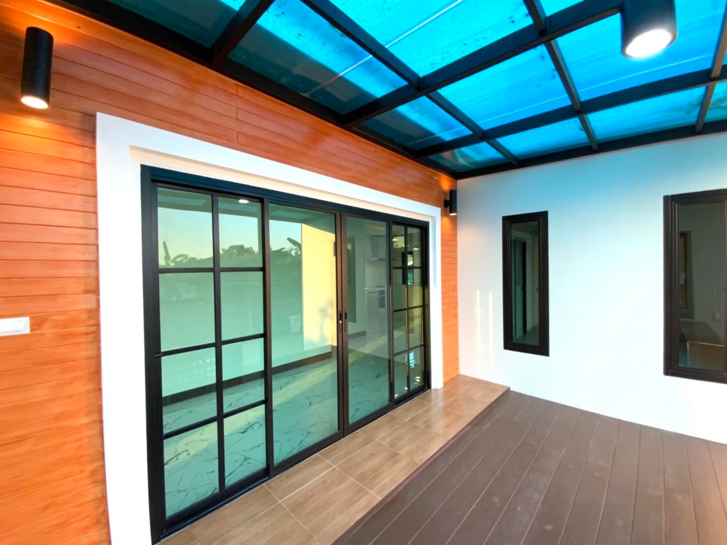 บ้านชั้นเดียว สไตล์คอนเทมโพลารี่ หลังคาทรงปั้นหยา 3 ห้องนอน 2 ห้องน้ำ ตกแต่งสีโทนสีเทากับสีสว่างสลับเข้ม