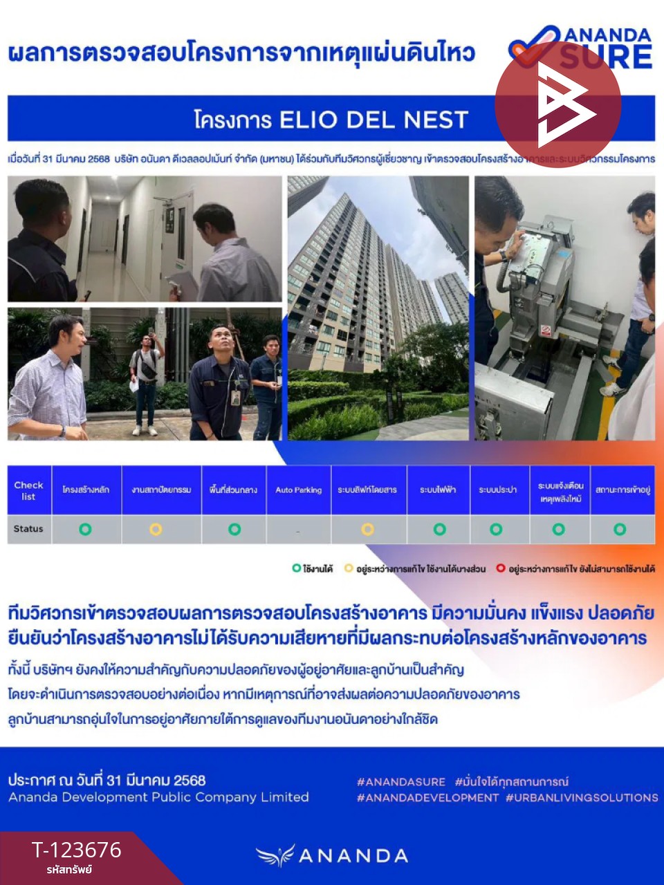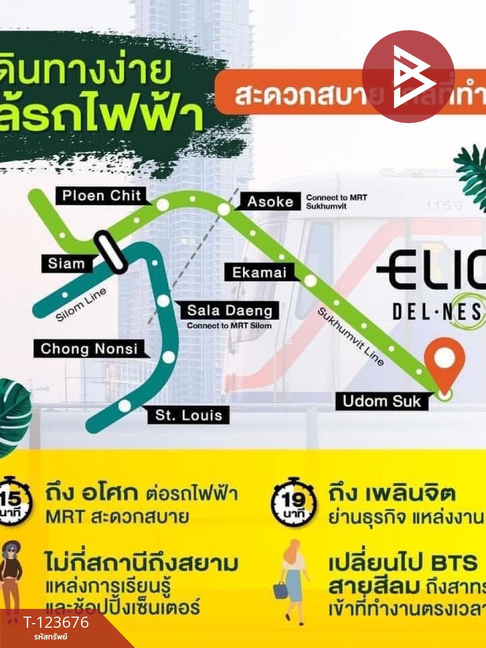 โครงการ : เอลลิโอ เดล เนสท์ (Elio Del Nest) ที่ตั้ง : ถนน อุดมสุข แขวงบางนา เขตบางนา กรุงเทพมหานคร รหัสทรัพย์ : T-123676 ประเภท : คอนโดมิเนียม สูง : 35 ชั้น อาคาร : C ห้องอยู่ชั้นที่ : 12 พื้นที่ใช้สอย : 26.31 ตารางเมตร ห้องนอน : 1 ห้อง ห้องน้ำ : 1 ห้อง ห้องอื่นๆ : 1 ห้องครัว จอดรถได้ : 1 คัน ทิศ : เหนือ รายละเอียดเพิ่มเติม : คอนโด เอลลิโอ เดล เนสท์ (Elio Del Nest) ใกล้ BTS อุดมสุข เฟอร์นิเจอร์ครบ พร้อมอยู่ - ไม่ได้รับความเสียหายจากแผ่นดินไหว, ได้รับการตรวจสอบโดยผู้เชี่ยวชาญเรียบร้อย - คอนโดที่ให้ความเป็นส่วนตัว ตั้งอยู่ในย่านธุรกิจ เดินทางสะดวก - ห้องครัวกั้นแยกเป็นสัดส่วน - ห้องน้ำกั้นห้องกระจกแยกโซนอาบน้ำเป็นสัดส่วน - ห้องระเบียงหันทางทิศเหนือ ไม่ร้อน วิวสวยมาก - เฟอร์นิเจอร์ครบ - เข้าออกด้วยระบบคีย์การ์ด - ใกล้ BTS อุดมสุข (750ม.) มีรถตู้รับ-ส่งฟรี ใกล้ตลาดอุดมสุข - ค่าส่วนกลาง ประมาณ 8,000.- บาท (ชำระ 6 เดือน 1 ครั้ง) - ขายพร้อม ผู้เช่า ค่าเช่า 11,000.- / เดือน (สัญญาหมด มี.ค 2026) ของแถม - ชุดครัว built-in ( แยกห้องครัว ห้องนอนเป็นสัดส่วน) - เตาไฟฟ้า, เครื่องดูดควัน, ไมโครเวฟ 23 ลิตร - เครื่องทำน้ำอุ่น - เครื่องปรับอากาศ 1 เครื่อง(18,000 btu) - เครื่องซักผ้า ฝาหน้า 8 กก. - เตียงนอนพร้อมที่นอน - ตู้เสื้อผ้า - โต๊ะเครื่องแป้ง - โต๊ะอเนกประสงค์พับเก็บได้ - โซฟา L Shape ขนาดใหญ่ สถานที่ใกล้เคียง - BTS อุดมสุข ห้างสรรพสินค้า - เซ็นทรัลบางนา, เดอะ แบ็งค็อก มอลล์, เมกา บางนา, อิเกีย, พาราไดซ์ พาร์ค, ซีคอน สแควร์, เทสโก้ โลตัส, บิ๊กซี สวนสาธารณะ - สวนหลวง ร.9 โรงพยาบาล - โรงพยาบาลกล้วยน้ำไท 2, โรงพยาบาลไทยนครินทร์, โรงพยาบาลบางนา 1, โรงพยาบาลศิครินทร์, โรงพยาบาลปิยะมินทร์, สิ่งอำนวยความสะดวก : รักษาความปลอดภัย 24 ชม., กล้องวงจรปิด CCTV, สระว่ายน้ำ, ฟิตเนส, ห้องประชุม, ที่จอดรถ ราคา : 3,290,000 บาท ลิงค์แผนที่ : https://maps.google.com/?q=13.67898336,100.61607052 **เรามีบริการจัดสินเชื่อให้ฟรี พร้อมยินดีให้คำปรึกษา มีให้เลือกทุกธนาคาร** **พร้อมอัตราดอกเบี้ยพิเศษ และ วงเงินสูงสุด 90-100% ของราคาประเมิน** สนใจสอบถามข้อมูลเพิ่มเติม หรือ นัดชมบ้านได้ที่ Tel : 0929742245 กระแต (รหัสตัวแทน 6812) Line ID : kt4565 Callcenter : 02-047-4282 สนใจดูทรัพย์อื่นๆ เพิ่มเติม มากกว่า 3,000 รายการ www.tb.co.th The Best Property Agent CO,.LTD. ผู้นำด้านธุรกิจนายหน้า ตัวแทนอสังหาริมทรัพย์ครบวงจร ด้วยความเป็นมืออาชีพ ใช้เทคโนโลยี และ นวัตกรรมที่สร้างสรรค์ เพื่อส่งมอบบริการที่ดีที่สุดเพื่อคุณ ให้บริการด้าน ซื้อ ขาย เช่า อสังหาริมทรัพย์