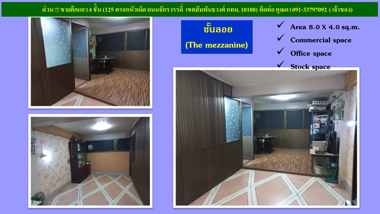 ✅ตึกแถว: ที่ตั้ง 125 ถนนจักรวรรดิ์ แขวงจักรวรรดิ์ เขตสัมพันธวงศ์ กทม. 10100 https://maps.app.goo.gl/xY9ihb5HjMk9zWyF9 ✅ตึกแถว 4ชั้น (มีชั้นลอยและดาดฟ้า) ขนาด 4.0 X12 0 ตร.ม. พื้นที่ใช้สอย 350 ตร.ม. ✅เป็นตึกแถวหลังเดียวที่เชื่อมทะลุกับร้านค้า (เลขที่ 234) ทำให้พื้นที่ใช้สอยกว้าง 4.0 ม.ลึกถึง 23.0 ม. ✅ย่านธุรกิจ เหมาะค้าขาย ขายส่ง คลังกระจายสินค้า พร้อมอยู่อาศัย คมนาคมสะดวกปลอดภัย ✅อุปกรณ์ไฟฟ้า: แอร์(สภาพใหม่) 5 เครื่อง / เครื่องทำน้ำอุ่น 2 เครื่อง /เครื่องซักผ้า(สภาพใหม่) 1 เครื่อง/ ตู้เย็นใหญ่ 1 เครื่อง ✅เฟอร์นิเจอร์: ตู้เสื้อผ้าและตู้โชว์แบบ Built in ขนาดใหญ่ ไม้เนื้อแท้ สวยงาม / เตียงนอน ขนาดใหญ่ ✅ใกล้สำเพ็ง สะพานหัน พาหุรัด คลองถม เยาวราช ท่าน้ำราชวงศ์ / MRT สามยอด และ MRT วัดมังกร เพียง 500- 800 เมตร ✅จุดเด่น เชื่อนต่อกับร้านค้า เลขที่ 234 (ติดถนนจักรวรรดิ์) ขนาด 3.0 X 12.0 ตร.ม. / 2 ชั้น /พื้นที่ใช้สอย 75 ตร.ม. ค่าเช่าเดือนละ 35,000 บาท ต่อเดือน (ให้สิทธิ์เฉพาะผู้ซื้อตึกแถวเท่านั้น) ✅ ราคา 11.99 ล้าน (ต่อรองราคาได้) โปรดติดต่อคุณดา 0913797092 / Line: 0913797092/ rachadahem@gmail.com