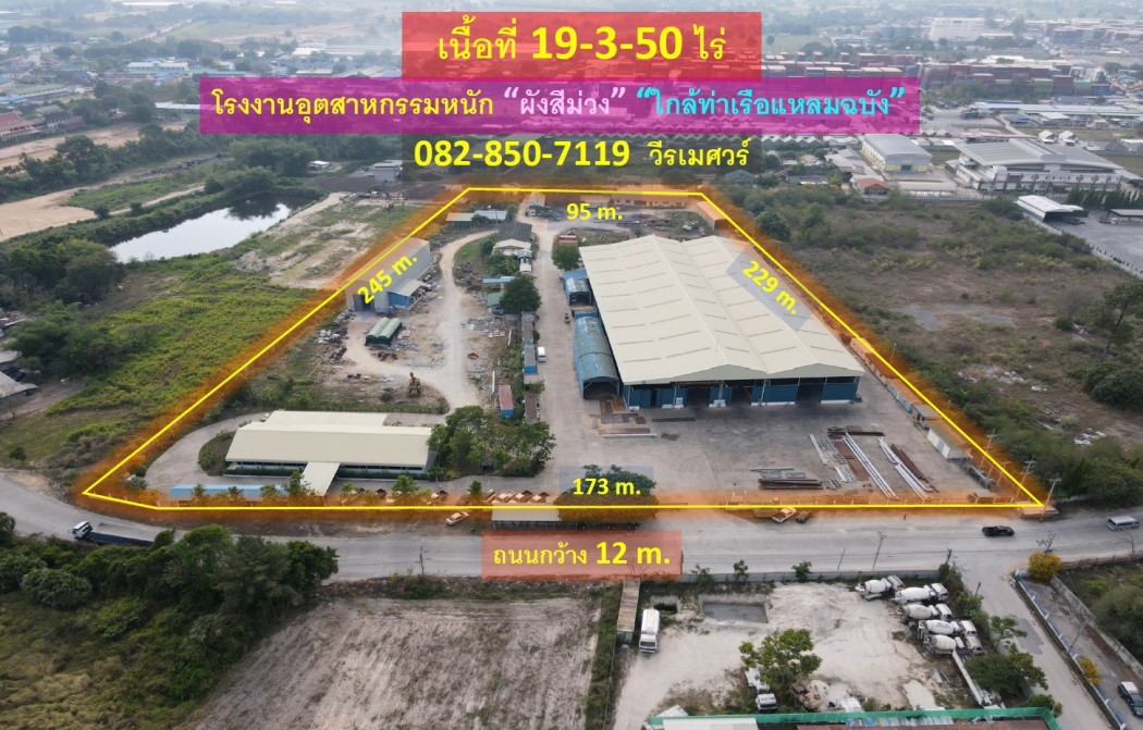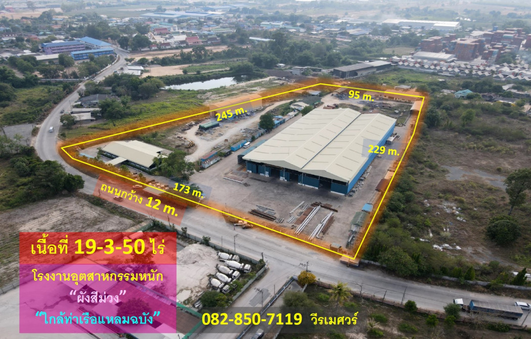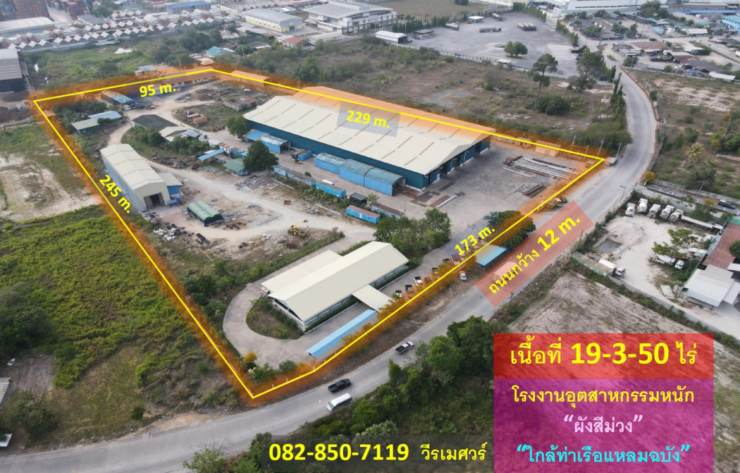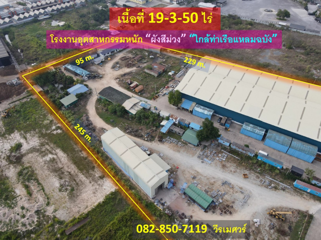 ขายด่วน ที่ดิน โรงงานอุตสาหกรรมหนัก แหลมฉบัง (ผังสีม่วง + ใกล้ท่าเรือแหลมฉบัง) 19-3-50 ไร่ รูปที่ดินเป็นถุงเงิน หน้ากว้าง 173 m. ถนนกว้าง 12 m. **รายละเอียดทรัพย์** ที่ดิน โรงงานอุตสาหกรรมหนัก แหลมฉบัง (ผังสีม่วง + ใกล้ท่าเรือแหลมฉบัง) - เนื้อที่ 19-3-50 ไร่ - รูปที่ดินเป็นถุงเงิน - เมื่อหันหน้าเข้าที่ดิน - หน้ากว้าง 173 m. - ฝั่งด้านซ้ายกว้าง 245 m. - ฝั่งด้านขวากว้าง 229 m. - ฝั่งด้านหลังกว้าง 95 m. - ถนนหน้าที่ดินเป็นถนนสาธารณะประโยชน์ ขนาดถนนกว้าง 12 m. 1.สิ่งปลูกสร้างภายในที่ดินเป็นโรงงานขนาดใหญ่ พื้นที่โรงงาน 4,500 ตร.ม. 2.พื้นที่สำนักงาน 500 ตร.ม. ## มีใบอนุญาตประกอบกิจการโรงงาน รง.4 ## **จุดเด่น** - ใกล้ท่าเรือแหลมฉบัง - ผังสีม่วง โรงงานอุตสาหกรรมหนัก - มีใบอนุญาตประกอบกิจการโรงงาน รง.4 **ศักยภาพที่ดิน** “สีม่วงอ่อนมีจุดสีขาว” - พื้นที่: 6 (ที่ดินประเภทพัฒนาอุตสาหกรรม) - ผังเมือง: แผนผังการใช้ประโยชน์ในที่ดิน และแผนผังการพัฒนาโครงสร้างพื้นฐานและระบบสาธารณูปโภค เขตพัฒนาพิเศษ ภาคตะวันออก ## มีใบอนุญาตประกอบกิจการโรงงาน รง.4 ## _________ **ที่ตั้ง** ชลบุรี-พัทยา Highway, ตำบลหนองขาม อำเภอศรีราชา ชลบุรี 20130 ราคา 110,000,000 บาท ด่วนนน!! (ค่าโอน คนละครึ่ง) #เนื้อที่รวมทั้งหมด 7,950 ตารางวา #เฉลี่ยตารางวาละ 13,836 บาท #เฉลี่ยไร่ละ 5.534 ล้านบาท **สถานที่ใกล้เคียง** - ใกล้ท่าเรือแหลมฉบัง - ใกล้นิคมอุตสาหกรรมแหลมฉบัง - ใกล้นิคมอุตสาหกรรมปิ่นทอง ___________________________________________ ******ปรึกษามืออาชีพ โทร. / สนใจติดต่อ นัดชมทรัพย์****** Phone: 082-850-7119 วีรเมศวร์ (นิว) Line : @toplandsofthailand (มี @ ด้วยครับ) Email: Ph1Werames@gmail.com