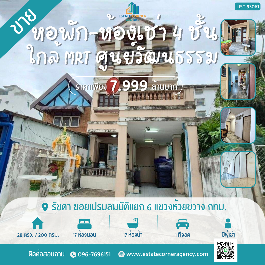 ขายด่วน หอพัก-ห้องเช่า 4 ชั้น 28 ตร.ว. ราคาดี โซนรัชดา ซอยเปรมสมบัติแยก 6 ใกล้ MRTศูนย์วัฒนธรรม