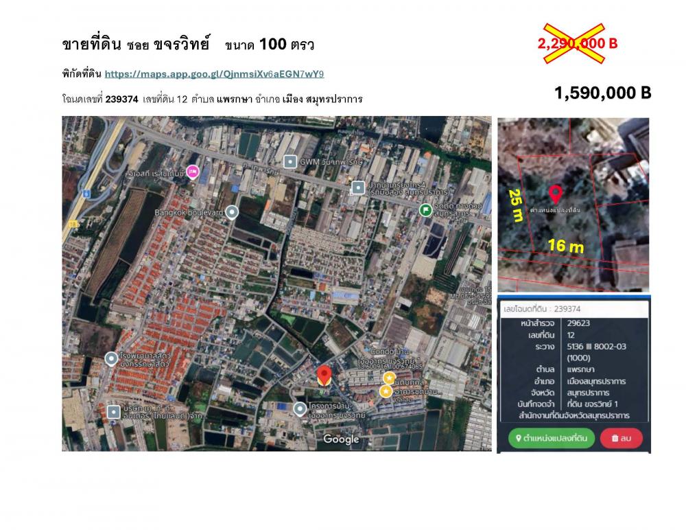 ขายที่ดินซอยขจรวิทย์️️ราคาถูก ที่ดินเปล่า ที่ตั้ง : ซ.ขจรวิทย์ ต.แพรกษา อ.เมืองสมุทรปราการ ราคา : 1,590,000บาท เนื้อที่ขนาด 100 ตารางวา สถานที่ใกล้เคียง -ใกล้ถนนเทพารักษ์ 1.5 Km. -ที่ดินติดกับหมู่บ้านเอื้ออาทรขจรวิทย์ ️ -ใกล้ตลาดหัวถนนเทพารักษ์ สอบถามรายละเอียดเพิ่มเติม Tell : คลิกเพื่อดูเบอร์โทรติดต่อ โหน่ง line : @ihouse_property พิกัด google map https://goo.gl/maps/B9QHHTS6rkiT5BMS7