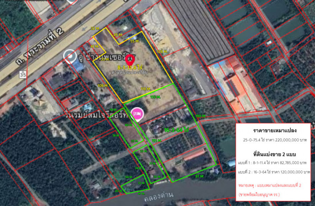 ขายที่ดินพร้อมรีสอร์ท 25-0-75.4 ไร่ (แบ่งขาย) ติดถนนพระรามที่ 2 จ.สมุทรสงคราม ที่ตั้ง : ตำบลบางขันแตก อำเภอเมืองสมุทรสงคราม จังหวัดสมุทรสงคราม รายละเอียดที่ดิน (แบบยกแปลง) ขนาด : 25 ไร่ 0 งาน 75.4 ตารางวา (ขายพร้อมใบอนุญาต รร.) ราคา : 220,000,000 บาท ค่าโอน : คนละครึ่ง หน้ากว้าง : 32 เมตร ความลึก : 361 เมตร รายละเอียดที่ดิน (แบบแบ่งขาย) แบบที่ 1 : ขนาด 8 ไร่ 1 งาน 11.4 ตารางวา ราคา 82,785,000 บาท แบบที่ 2 : ขนาด 16 ไร่ 3 งาน 64 ตารางวา ราคา 120,000,000 บาท (ขายพร้อมใบอนุญาต รร.) ค่าโอน : คนละครึ่ง สถานที่ใกล้เคียง โรงเรียนวัดศรีสุวรรณคงคาราม(ราษฎร์สงเคราะห์) สพป.สมุทรสงคราม 0.58 กม. โรงเรียนบ้านขันแตก 1.66 กม. โรงเรียนดรุณานุกูล 3.36 กม. โรงพยาบาลส่งเสริมสุขภาพตำบลแหลมใหญ่ 3.09 กม. องค์การบริหารส่วนตำบลบางขันแตก 2.66 กม. ฟาร์มม้า อัมพวา 2.40 กม. ท่าเรือพาณิชย์แม่กลอง 4.64 กม. เซเว่นอีเลฟเว่น ปตท.บ้านดอนจั่น (รหัสสาขา: 02279) 0.83 กม. เซเว่นอีเลฟเว่น PTTOR บางขันแตก สมุทรสงคราม (รหัสสาขา: 17898) 2.55 กม. เซเว่นอีเลฟเว่น ตลาดปลาแม่กลอง (รหัสสาขา: 07905) 2.69 กม. เซเว่นอีเลฟเว่น PTTOR คลองโคน พระราม2 (รหัสสาขา: 15944) 2.73 กม. เซเว่นอีเลฟเว่น ปตท.คลองโคน (รหัสสาขา: 02108) 2.76 กม. ติดต่อสอบถาม คุณชุติญา โทร : 094-516-1565 Line : maninya Onland459 โทร : 091-979-1491 Line : @realistestate รายละเอียดเพิ่มเติม : ขายด่วนที่สุด