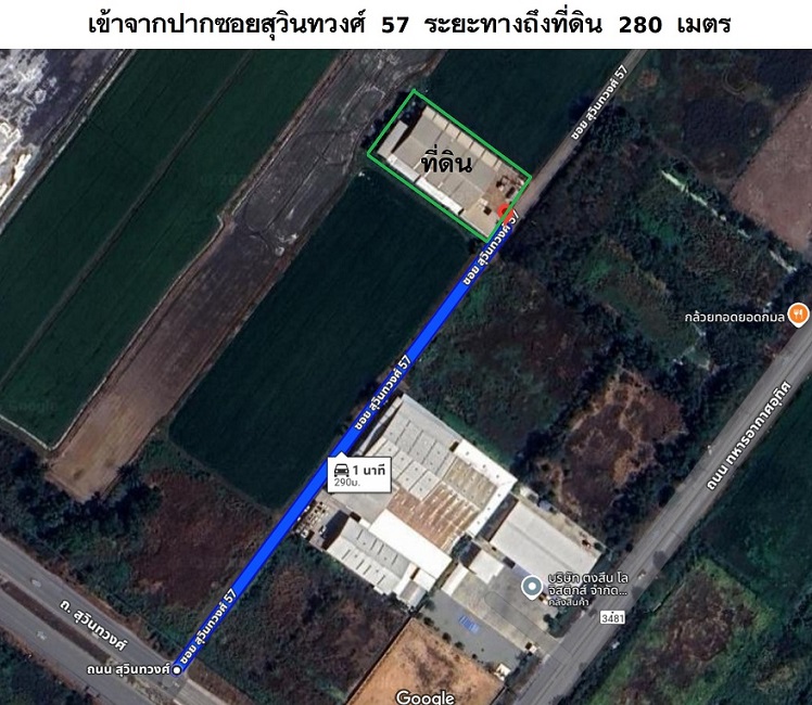 ขายที่ดินพร้อมโกดัง ซอยสุวินทวงศ์ 57 เนื้อที่ 1-3-18 ไร่ ถนนสุวินทวงศ์ แขวงกระทุ่มราย เขตหนองจอก กรุงเทพฯ