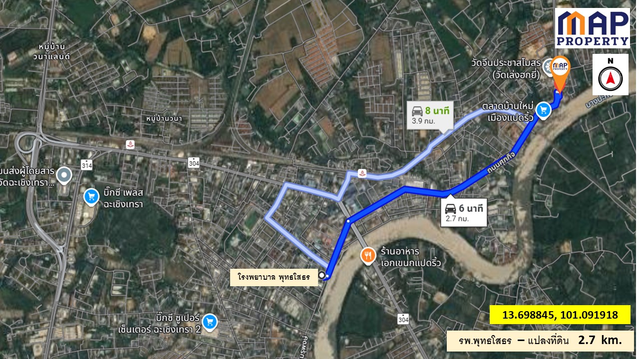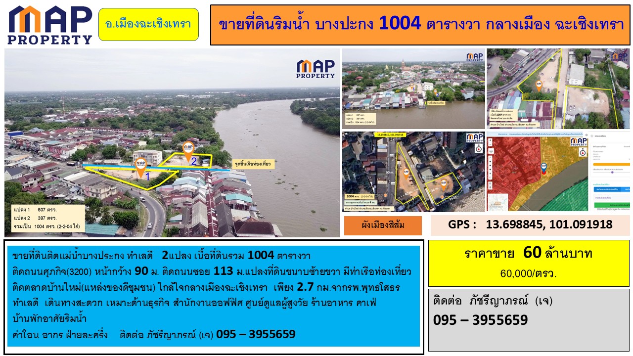 ขายที่ดินติดแม่น้ำบางประกง ทำเลดี 2แปลง เนื้อที่ดินรวม 1004 ตารางวา ติดถนนศุภกิจ(3200) หน้ากว้าง 90 ม ติดถนนซอย 113 ม.แปลงที่ดินขนาบซ้ายขวา มีท่าเรือท่องเที่ยว ติดตลาดใหม่(แหล่งของดีชุมชน) ใกล้ใจกลางเมืองฉะเชิงเทรา เพียง 2.7 กม.จากรพ.พุทธโสธร ทำเลดี เดินทางสะดวก เหมาะด้านธุรกิจ สำนักงานออฟฟิศ ศูนย์ดูแลผู้สูงวัย/ร้านอาหาร คาเฟ่ บ้านพักอาศัยริมน้ำ ค่าโอน อากร ฝ่ายละครี่ง ติดต่อ ภัชรีญาภรณ์ (เจ) 095 – 3955659