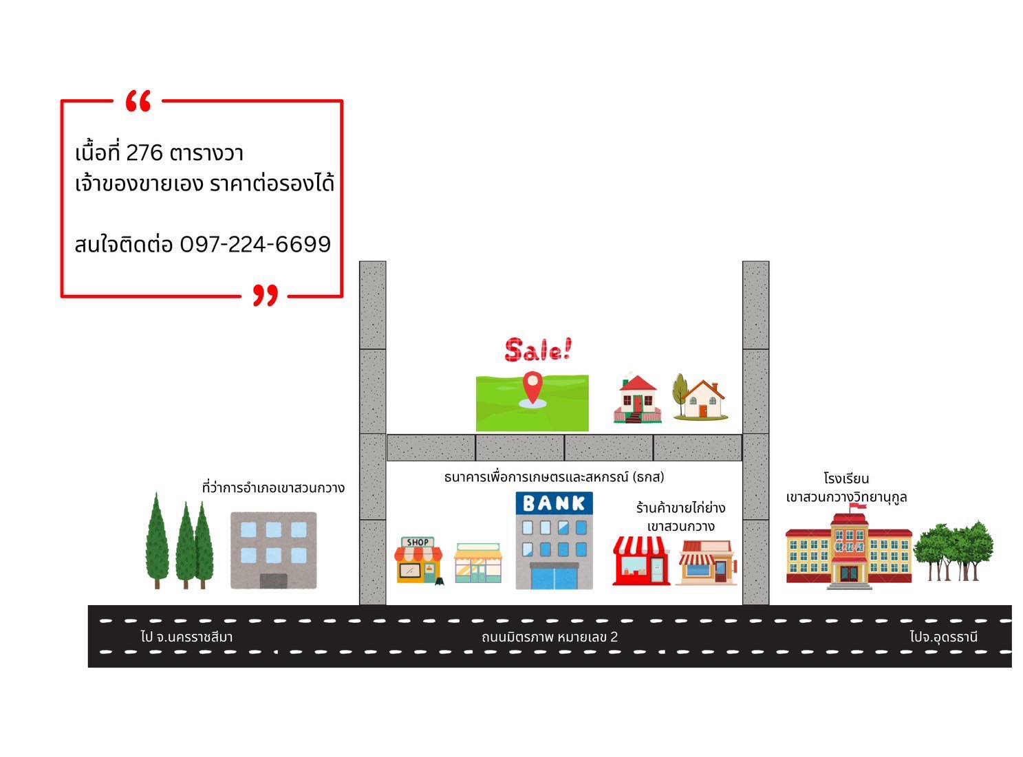 ขายที่ดินเปล่า เนื้อที่ 276 ตารางวา (ถมแล้ว) อยู่ข้างที่ว่าการอำเภอเขาสวนกวาง จังหวัดขอนแก่น ห่างจากถนนมิตรภาพ 120 เมตร ใกล้โรงเรียนเขาสวนกวางวิทยานุกูล อยูด้านหลังธนาคาร ธกส. ราคาถูก 800,000 บาท (ราคาต่อรองได้ครับ) เหมาะแก่การทำหอพัก และสร้างบ้านอยู่อาศัยครับ เจ้าของขายเอง สนใจติดต่อ โทร : 097-224-6699
