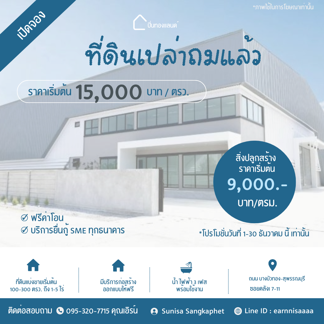 ขายที่ดินเปล่า พร้อมก่อสร้าง ( เหมาะสร้าง โกดัง,โรงงาน,คลังสินค้า , โฮมออฟฟิศ )ที่ดินขนาด100-200-300 ตรว. ถึง 1-5ไร่+ สิ่งปลูกสร้างตามขนาดที่ลูกต้องการใช้งาน ถนนในโครงการ กว้าง 10 เมตร มีน้ำ มีไฟฟ้า 3 เฟส เรียบร้อย ราคาขาย เริ่ม 15,000 / ตรว. มีบริการรับเหมาก่อสร้าง ออกแบบเขียนแบบให้ฟรี สามารถออกแบบเองได้หรือเอาแบบมาให้ทางช่างดูได้ ใช้เวลาในการก่อสร้าง 3-4 เดือน ( ขึ้นอยู่กับขนาดของสิ่งปลูกสร้าง ) เริ่มทำการก่อสร้างให้ทันทีหลังเซ็นสัญญาเสร็จ ขนาดสิ่งปลูกสร้างและวัสดุในการก่อสร้าง คิดตามจริง ไม่มีบวกเพิ่มค่ะ มีบริการยื่นกู้ SME ทุกธนาคาร ฟรี พิกัด : ศูนย์กระจายสินค้า 7-11 , Sb design , Tops , โรงงานสก็อต ถนน บางบัวทอง-สุพรรณบุรี ( 340 ) อยู่ในแหล่งทำเลทอง ย่านลาดหลุมแก้ว ปทุมธานี , บางบัวทอง นนทบุรี