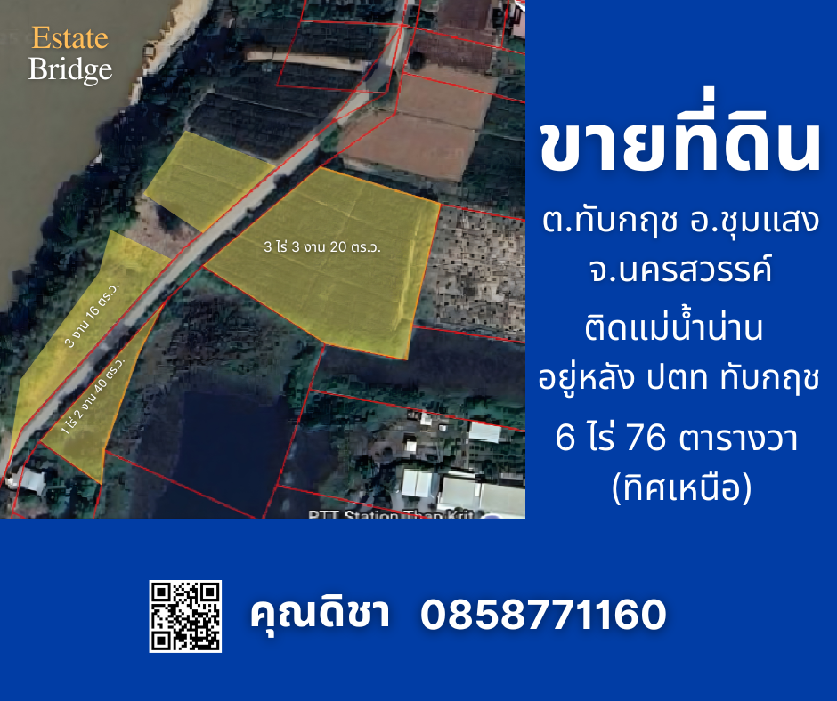 ขายที่ดินเปล่า 6 ไร่ 76 ตารางวา ติดแม่น้ำ ต.ทับกฤช อ.ชุมแสง จ.นครสวรรค์ ราคาไร่ละ 500,000 บาท สถานที่ใกล้เคียงและการเดินทาง เพียง 2.4 กม. ถึงถนน บายพาส -PTT Station ปตท.ทับกฤช 1.4 กม. -องค์การบริหารส่วนตำบลทับกฤช 2.5 กม. ที่อยู่ : ต.ทับกฤช อ.ชุมแสง จ.นครสวรรค์ พิกัด : https://maps.app.goo.gl/omEY4xYnswEMMWf18?g_st=al สนใจติดต่อ : คุณจุ๊บแจง 080-993-8833 Line ID: https://line.me/ti/p/0c6h0Lmp-Q คลิกเพิ่มเพื่อน รับฝาก ขาย อสังหาฯ ครบวงจร