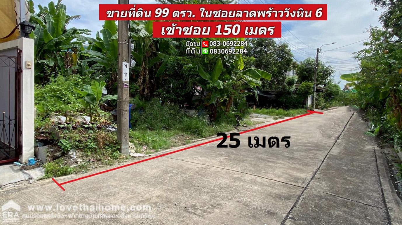 ขายที่ดิน ลาดพร้าววังหิน 6 เข้าซอย 150 เมตร เนื้อที่ 99 ตรว. หน้ากว้าง 25 เมตร อยู่ใกล้ถนนโชคชัย 4