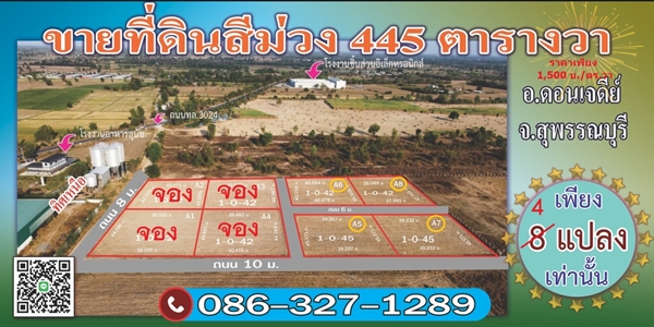 R21- 01 ขายที่ดิน สีม่วงล้วน อ.ดอนเจดีย์ จ.สุพรรณบุรี 455 ตารางวา ราคา 1,500 บาท/วา ยกแปลง 667,500 บาท โทร/ไลน์ 086 327 1289 (คุณนก) ที่ดินสีม่วงล้วน เหมาะเริ่มต้นธุรกิจหรือขยายธุรกิจให้ใหญ่ขึ้น มีเพียง 4 แปลง เท่านั้น โฉนดครุฑแดง ที่ดินดอน น้ำไม่ท่วม หน้ากว้างติดถนน 40 เมตร ลึก 40 เมตร ไลน์/โทร 099 979 4497 พิกัด : https://goo.gl/maps/SEuh6x1iAeirfWpH6