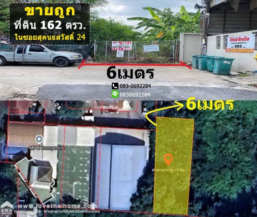 ซอย สุคนธสวัสดิ์ 24 ถนน สุคนธสวัสดิ์ แขวง ลาดพร้าว เขต ลาดพร้าว จังหวัด: กรุงเทพมหานคร - ที่ดินเปล่า 162 ตรว. ถ.สุคนธสวัสดิ์ 24 - หน้ากว้าง 15 ม. ลึก 40 ม. - ที่ดินสุคนธสวัสดิ์ 24 เข้าซอยเพียง 250 เมตร - ราคาถูก ทำเลดี การเดินทางสะดวก สามารถเดินทางไปยัง ถ.เกษตรนวมินทร์และถนนเลียบทางด่วนประดิษฐ์มนูธรรม - ใกล้ จุด-ขึ้น ทางด่วนโยธินพัฒนา เดินทางไม่เกิน 10 นาที - ใกล้แหล่งอาหารการกิน และห้างสรรพสินค้าต่างๆดังนี้ ตลาดหัวมุม,ห้างเซ็นทรัลอีสต์วิลล์,ห้างโลตัส,แม็คโคร,Homepro เลียบทางด่วน,คริสตัลปาร์ค ,CDC ราคา ตารางวาละ 48,000 บาท ค่าโอน ภาษี อากร ทั้งหมด ผู้ซื้อ ผู้ขาย ออกฝ่ายละครึ่ง ดู youtube https://www.youtube.com/watch?v=ups88dVjxmQ ดูรูปเพิ่มเติมที่ https://www.lovethaihome.com/assets/view/30f28305-1e6a-42d8-954a-7e2f7dd7bed2 พิกัด https://maps.app.goo.gl/JGj4na89cvznkW3a7 นัดชมบ้าน: คุณแม็ก Tel: 083-0692284 Line id : 0830692284 บริการนายหน้าขายบ้าน ที่ดิน โกดัง โรงงาน
