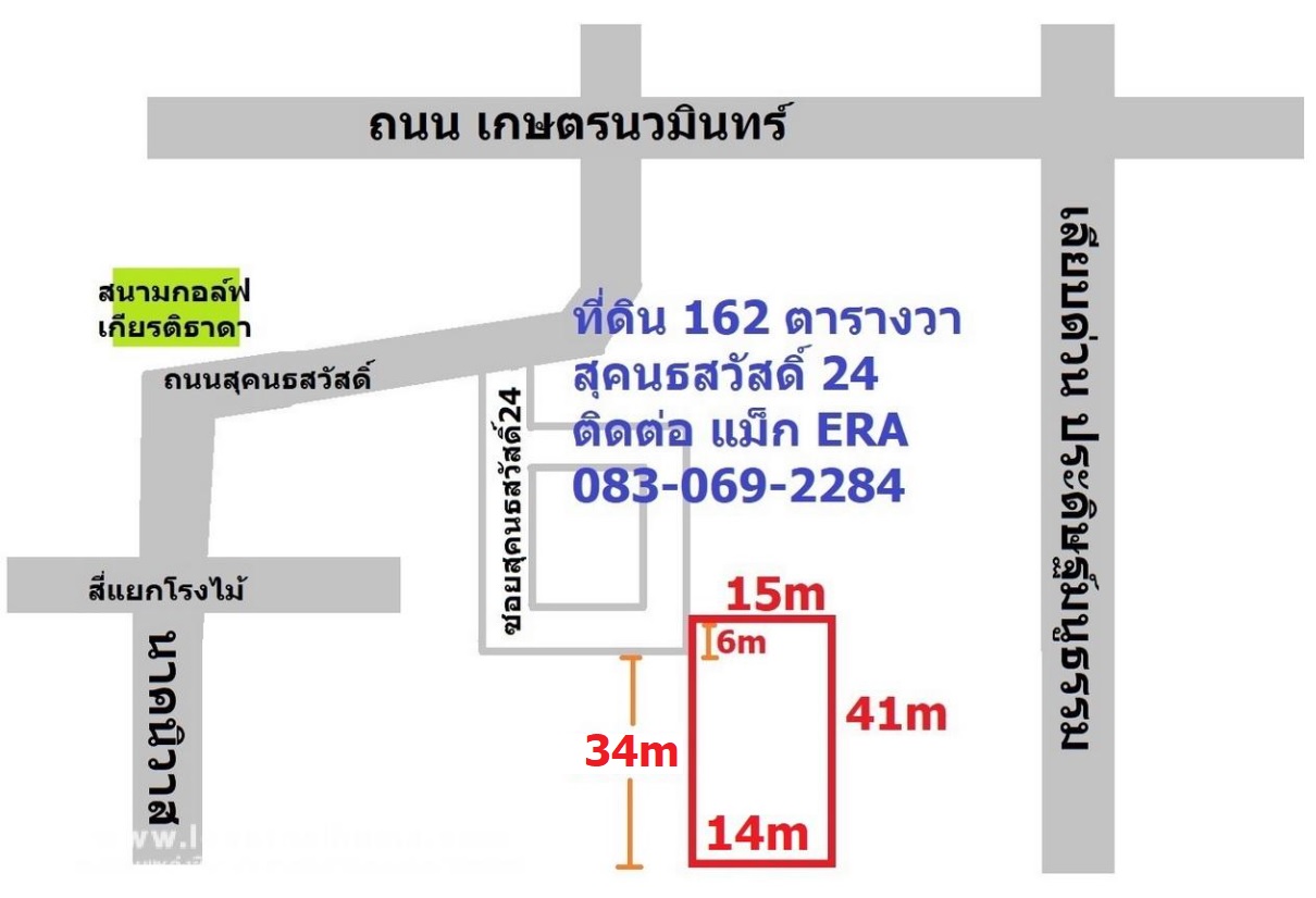ขายที่ดิน สุคนธสวัสดิ์ 24 ใกล้เกษตรนวมินทร์ และ เลียบทางด่วนประดิษฐ์มนูธรรม 162 ตารางวา