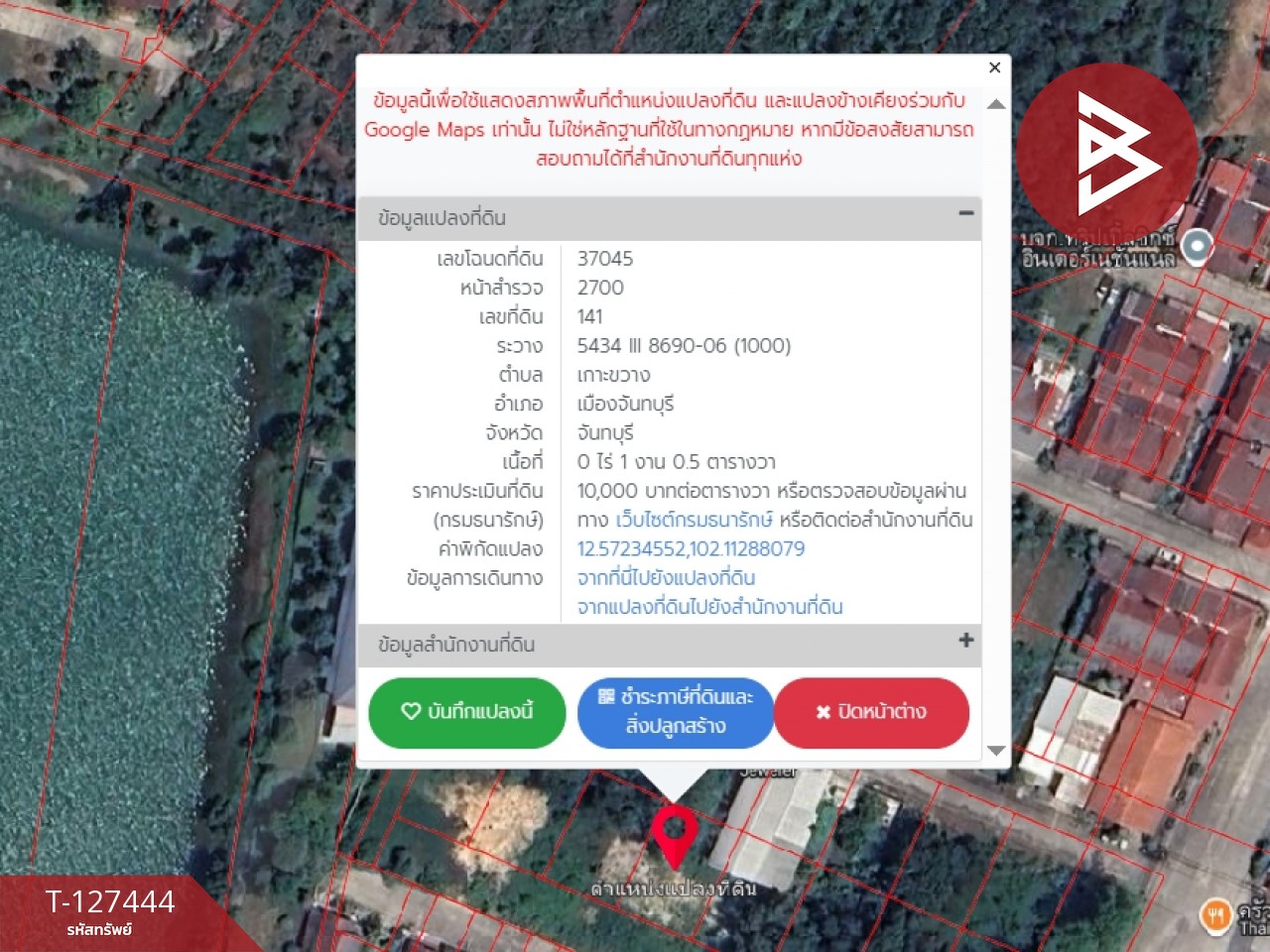 ที่ดินเ : เกาะขวาง จันทบุรี ที่ตั้ง : ต.เกาะขวาง อ.เมืองจันทบุรี จ.จันทบุรี รหัสทรัพย์ : T-127444 ประเภท : ที่ดิน เนื้อที่ : 1 งาน 0.5 ตารางวา กว้าง : 16.00 เมตร ลึก : 25.00 เมตร ทิศ : ใต้ รายละเอียดเพิ่มเติม : ที่ดินสวย มีหลักเขตชัดเจน อาจต้องถมเล็กน้อย เพื่อให้สวยงาม ทำเลดี ราคาดีแน่นอน พร้อมอยู่ปลูกบ้าน ถนนโครงการกว้างขวาง สิ่งอำนวยความสะดวกครบ บรรยากาศดี พร้อมระบบ รปภ.ตลอด 24 ชม. แบ่งล๊อคๆละ 100 ตร.วา ทำเลดี ใกล้ทางเข้าออกโครงการ เข้าออกสะดวกมาก เกาะขวาง จันทบุรี สถานที่ใกล้เคียง เซ็นทรัล โรบินสัน บิ๊กซี จันทบุรี โรงพยาบาล สิริเวช พระปกเกล้า กรุงเทพ จันทบุรี โรงเรียนสตรีมารดา และโรงเรียนชื่อดังหลายแห่ง เพียง 5-10 นาที ราคา : 2,190,000 บาท **เรามีบริการจัดสินเชื่อให้ฟรี พร้อมยินดีให้คำปรึกษา มีให้เลือกทุกธนาคาร** **พร้อมอัตราดอกเบี้ยพิเศษ และ วงเงินสูงสุด 90-100% ของราคาประเมิน** สนใจสอบถามข้อมูลเพิ่มเติม หรือ นัดชมบ้านได้ที่ Tel : 0628946964 โชติ (รหัสตัวแทน 5616) Line ID : hotshotx Tel : 0979355151 นุ่น (รหัสตัวแทน 5616-1) Line ID : 0813259589 Callcenter : 02-047-4282 สนใจดูทรัพย์อื่นๆ เพิ่มเติม มากกว่า 3,000 รายการ www.tb.co.th The Best Property Agent CO,.LTD. ผู้นำด้านธุรกิจนายหน้า ตัวแทนอสังหาริมทรัพย์ครบวงจร ด้วยความเป็นมืออาชีพ ใช้เทคโนโลยี และ นวัตกรรมที่สร้างสรรค์ เพื่อส่งมอบบริการที่ดีที่สุดเพื่อคุณ ให้บริการด้าน ซื้อ ขาย เช่า อสังหาริมทรัพย์