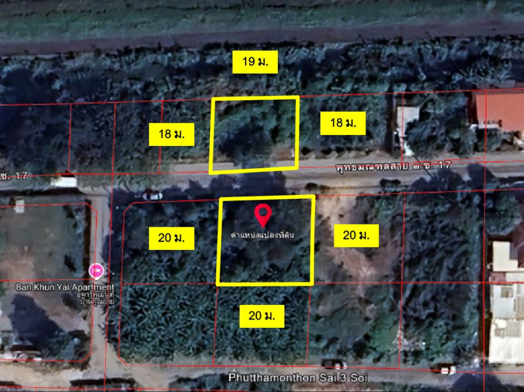ขายที่ดิน 2 แปลงติดถนนทั้ง 2 ฝั่ง พุทธมณฑลสาย 3 ซอย 17 เนื้อที่ 189 วา