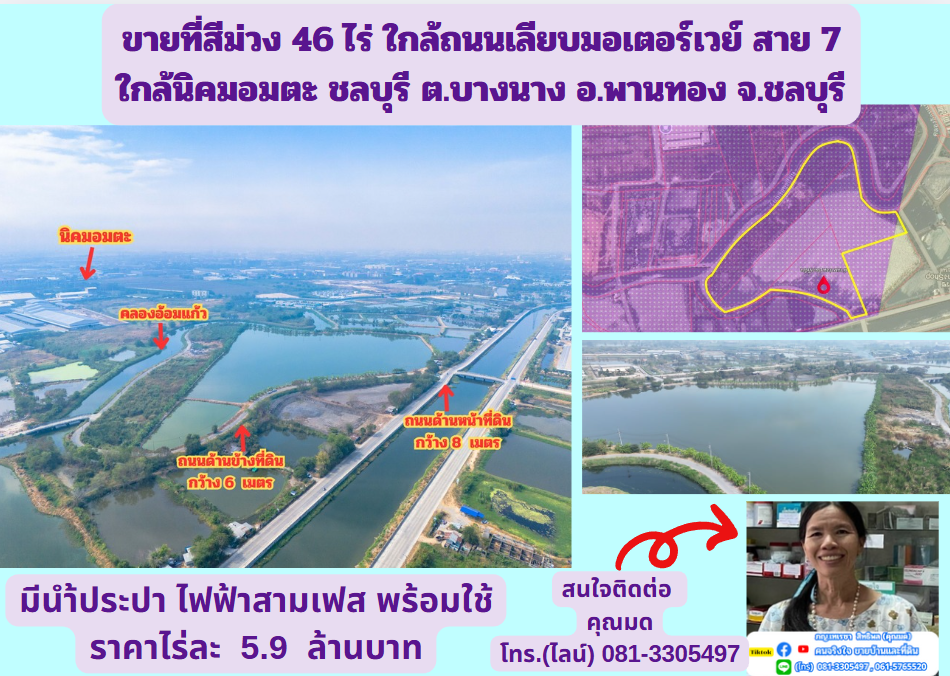 ขายที่สีม่วง 46 ไร่ ใกล้ถนนเลียบมอเตอร์เวย์ สาย 7 ใกล้นิคมอมตะ ชลบุรี ต.บางนาง อ.พานทอง จ.ชลบุรี
