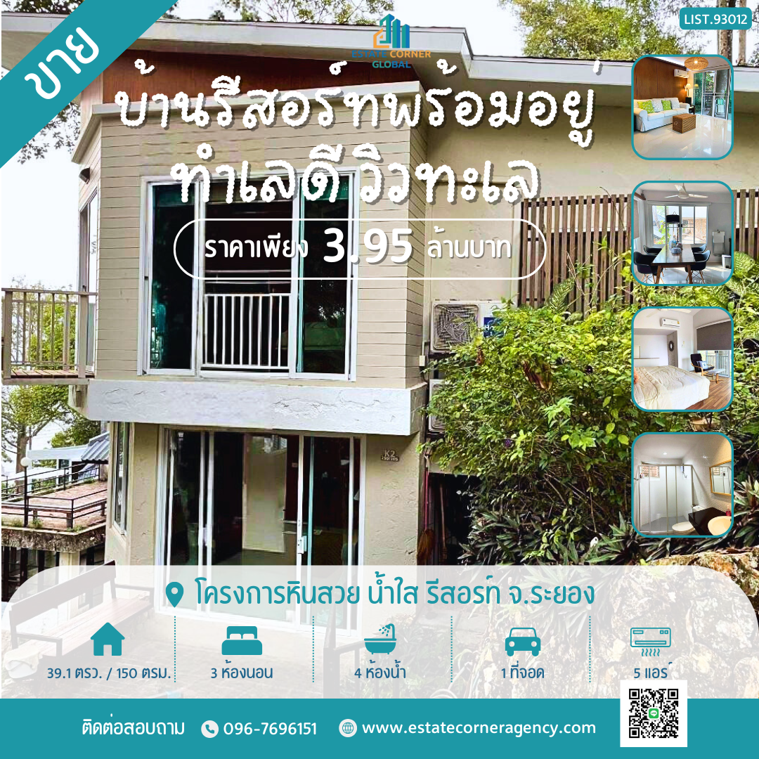 ขายบ้านรีสอร์ทพร้อมอยู่ ในโครงการหินสวย น้ำใส รีสอร์ท จังหวัดระยอง ราคา 3.95 ล้านบาท ทำเลดี วิวทะเล ใกล้แหล่งท่องเที่ยว พักผ่อนสบาย หรือปล่อยเช่าได้กำไร