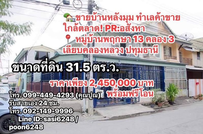 #ขายบ้านหลังมุม ทำเลค้าขาย ใกล้ตลาด! PR:อสังหา หมู่บ้านพฤกษา 13 คลอง 3 เลียบคลองหลวง ปทุมธานี