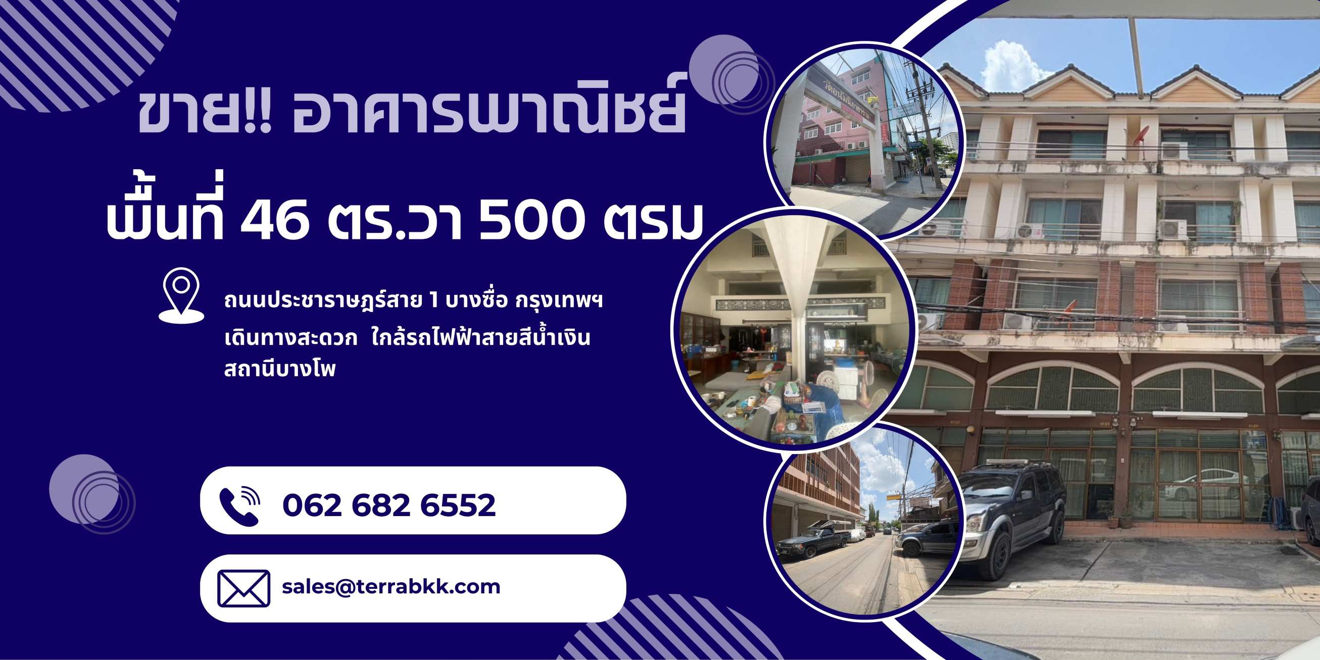 ขายอาคารพาณิชย์ เนื้อที่ 46 ตร.วา 500 ตร.ม. พร้อมที่จอดรถหน้าอาคารได้ถึง 4 คัน - ติดถนนซอย ห่างถนนใหญ่ประชาราษฏรสาย 1 ประมาณ 40 เมตร - เชื่อมต่อถนนวงศ์สว่าง 1 กม. - ใกล้ทางด่วนศรีรัช, วงแหวนรอบนอก - MRT บางโพ 500 เมตร - MRT เตาปูน 1.5 กม. - ทำเลภาพรวมเป็นถนนเส้นเมนในการเชื่อต่อถนนสายอื่น และมีธุรกิจขึ้นยาวตลอด 2 ฝั่ง+ย่านอยู่อาศัย เหมาะทำเป็นสำนักงาน หอพัก หรือ Hostel ขนาดย่อม https://maps.app.goo.gl/KSdhhoHiq8ALsGzE6 ขาย 25,000,000 บาท สุชาวดี พวงเพชร (หญิง) โทร. 062 682 6552