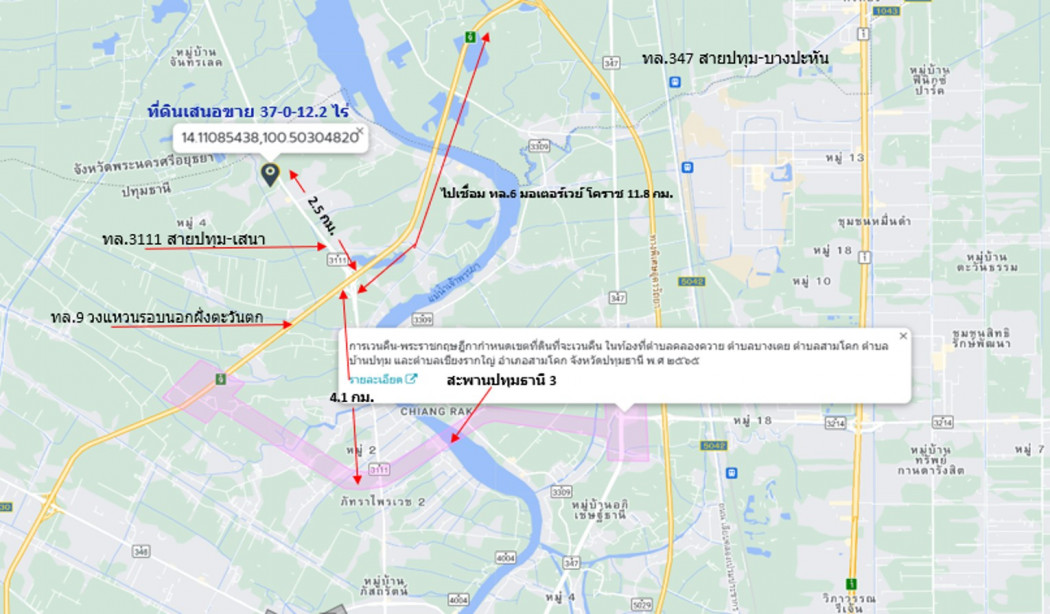 ขาย ที่ดิน ติดถนนสามโคก-เสนา ทล.3111 อ.สามโคก ปทุมธานี ทำเลดีพื้นที่ลงทุน เนื้อที่ 37 ไร่ 12.2 ตรว ลดลงราคา 36 ล้าน เจ้าของอยากขายมากๆ :: จุดเด่น :: ️การใช้ประโยชน์เพื่อการลงทุน : หมู่บ้านจัดสรร ห้างสรรพสินค้า ตลาด บริษัทธุรกิจ โรงแรม โรงพยาบาล ฯลฯ ️ห่างจากแนวเวนคืนโครงการก่อสร้างสะพานปทุมธานี 3 - 6.7 กม. ห่างจากเชื่อมทาง ทล.6 Motorway โคราช 11.8 กม. ️ห่างจากถนนวงแหวนกาญจนาภิเษก 2.5 กม. ️ที่ดินติดถนน 3 ด้าน - ถนนสายสามโคก-เสนา, ทล.ท้องถิ่นสายท้ายเกาะ-คูบางหลวง-ลาดหลุมแก้ว ️โดยรอบที่ดินสามารถเข้า-ออกได้หลายทาง : ไปออกถนนสายสามโคก-เสนา ด้านซอยศรีปทุม 1, ทางหลวงท้องถิ่นท้ายเกาะ-คูบางหลวง-ลาดหลุมแก้ว : ไปออกถนนวงแหวนกาญจนาฯ ด้านซอยลาดท้องวังใต้ และด้านถนนสายสามโคก-เสนา ️ผังเมืองรวมสีเขียว ⚖️ขายยกสองแปลง เป็นเงิน 149,000,000.- บาท (์Net) ⏬ลดราคาลงจาก 185 ล้านบาท (ไร่ละ 5 ล้านบาท) ค่าใช้จ่ายในการโอนทั้งหมด ผู้ซื้อเป็นผู้ชำระ