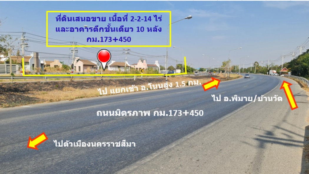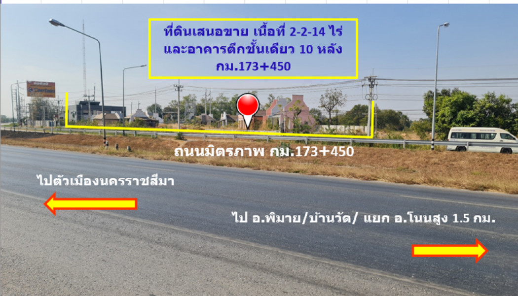 ขาย ที่ดิน ถนนมิตรภาพ กม.173-450 ต.ดอนหวาย อ.โนนสูง นครราชสีมา ทำเลการค้าและอุตสาหกรรม 2 ไร่ 2 งาน 14 ตรว ผังเมืองพื้นที่สีเขียว :: จุดเด่น :: ที่ดินติดถนนมิตรภาพ ถนน 6 เลน ฝั่งขาออก อำเภอโนนสูงตั้งอยู่ใกล้กับตัวเมืองนครราชสีมา ซึ่งเป็นศูนย์กลางทางเศรษฐกิจของภาคอีสาน และมีเส้นทางคมนาคมที่เชื่อมต่อไปยังภูมิภาคต่างๆ ได้สะดวก ที่ดินอยู่ห่างจากถนนทางเข้าอำเภอโนนสูงเพียง 1.5 กม. โดยรอบเป็นพื้นที่เกษตรกรรมทำนา แต่ด้านติดถนนมิตรภาพเป็นทำเลการค้าและอุตสาหกรรมหลากหลายธุรกิจ ที่ดินมีหน้ากว้างติดถนนมิตรภาพ 120 เมตร ปรับปรุงถมดินแล้วทั้งแปลง บนที่ดินเป็นที่ตั้งอาคารตึกชั้นเดียว 10 หลัง สภาพก่อสร้างประมาณ 80-90% สามารถเข้าซ่อมแซมปรับปรุงใช้ประโยชน์ทางธุรกิจได้ เช่น ร้านอาคารแนวคาเฟ่ / ให้เช่าเป็นบริษัทสำนักงาน-บ้านเช่ารายเดือน / รีสอร์ท / ศูนย์อาหารของนักท่องเที่ยว ราคาขายยกแปลงคิดคำนวณเฉพาะราคาที่ดินเท่านั้น ส่วนอาคารตึก 10 หลัง ยกให้ฟรี ราคาขายเป็นเงิน 12,500,000 บาท (ต่อรองได้) ⬇️ลดราคาลงจาก 16.5 ล้านบาท ค่าใช้จ่ายในการโอนทั้งหมด ฝ่ายละครึ่ง 50/50 สนใจติดต่อ : ต่อรองราคา : 063-826-9397 | 097-292-4942 ติดต่อผ่าน Line: jackleee นี้เท่านั้น :: รายละเอียด :: - ขนาด 2 ไร่ 2 งาน 14 ตร.วา รูปที่ดินคล้ายรูปสามเหลี่ยม เป็นที่ตั้งอาคารตึก จำนวน 10 หลัง สภาพก่อสร้างอาคาร 80-90% ไม่คิดคำนวณค่าก่อสร้างในราคาขายทั้งหมด ยกให้ฟรี :: สถานที่ใกล้เคียง :: - สำนักงานองค์การบริหารส่วนตำบลดอนหวาย - สถานีตำรวจภูธรโนนสูง จังหวัดนครราชสีมา - วัดดอนหวาย - โรงเรียนบ้านโตนด - โรงเรียนบ้านดอนหวาย พิกัด: http://maps.google.com/maps?q=15.097867,102.279268 ราคา: 12,500,000 บาท สนใจติดต่อ: JACK 0638269397 Line: jackleee
