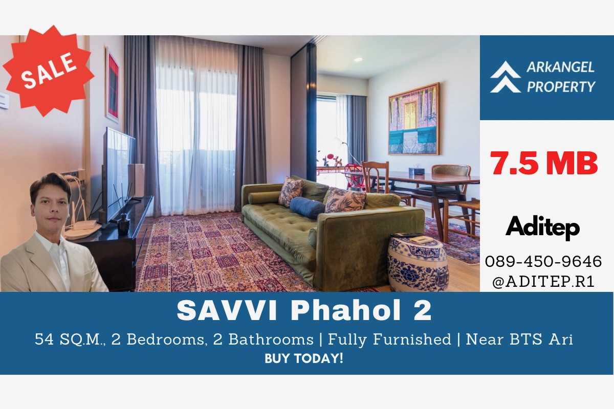ขาย แซฟวี่ พหล 2 คอนโดใกล้ BTS อารีย์ 54 ตร.ม. 2 ห้องนอน 2 ห้องน้ำ ตกแต่งใหม่ พร้อมอยู่ Property ID: M11504 --- VDO: https://youtu.be/FyqlACEMc1w --- **คอนโด แซฟวี่ พหล 2 (Savvi Phahol 2)** ที่ตั้ง ซอยพหลโยธิน 2 ถนนพหลโยธิน แขวงสามเสนใน เขตพญาไท กทม. https://maps.app.goo.gl/NFszHx2QdNetRx7A7 ชั้น 7 (อาคารสูง 7 ชั้น) ระเบียงหันทิศตะวันออกเฉียงเหนือ เนื้อที่ 53.99 ตร.ม. 2 ห้องนอน 2 ห้องน้ำ 1 ห้องนั่งเล่น เคาว์เตอร์ครัว เตาไฟฟ้า เครื่องดูดควัน แอร์ 3 เครื่อง --- **ขาย 7,500,000 บาท (ค่าโอน ออกคนละครึ่ง)** --- **ลักษณะเด่น :** ✨ **คอนโดหรู สไตล์โมเดิร์น ใจกลางพหลโยธิน — ทำเลศักยภาพ ใกล้แหล่งไลฟ์สไตล์อารีย์!** ???? **เพียงไม่กี่นาทีจาก BTS อารีย์** ???? ค้นพบการใช้ชีวิตในพื้นที่ที่ลงตัว ใจกลางกรุงเทพฯ! คอนโดมิเนียม SAVVI Phahol 2 มอบความสะดวกสบายให้คุณด้วยพื้นที่กว้างขวางที่ตกแต่งอย่างสวยงาม พร้อมเข้าอยู่ทันที **2 ห้องนอน 2 ห้องน้ำ** สุดหรู พร้อมพื้นที่ใช้สอยอย่างลงตัว ห้องนั่งเล่นและห้องครัวแบบ open plan ให้ความรู้สึกโปร่งโล่ง **ตกแต่งใหม่**เสร็จสมบูรณ์ ย้ายเข้าอยู่ได้ทันที วิวสวยเปิดกว้าง ให้ความรู้สึกปลอดโปร่ง สระว่ายน้ำระดับลักชัวรี่ ฟิตเนสเซ็นเตอร์ครบวงจร พื้นที่ส่วนกลางที่ออกแบบอย่างพิถีพิถัน ระบบรักษาความปลอดภัย 24 ชั่วโมง ที่จอดรถเพียงพอ ใกล้ **BTS อารีย์** เดินทางสะดวก ใกล้ **La Villa อารีย์**, **Big C สะพานควาย**, **โรงพยาบาลเปาโล**, และ **สวนจตุจักร** แวดล้อมด้วยร้านอาหาร คาเฟ่ และร้านค้ามากมาย เข้าถึงห้างสรรพสินค้าและซูเปอร์มาร์เก็ตได้ง่าย เดินทางเข้าสู่ใจกลางเมืองได้รวดเร็ว --- **สิ่งอำนวยความสะดวก :** - Serene Lobby Lounge - Urban Blue Swimming Pool - Light-filled Co-working Space - Tropical View Fitness - Secret Garden Lounge - Home Automation ภายในห้องพักอาศัย - Shuttle Service - ลิฟต์โดยสาร 2 ตัว - อัตราส่วนลิฟต์รวมทั้งโครงการ 32 : 1 - ที่จอดรถประมาณ 52 คันคิดเป็น 81% (Automatic Parking) - ระบบรักษาความปลอดภัยในโครงการ Parking Gate, CCTV, Key Card --- **สถานที่ใกล้เคียง :** - BTS อารีย์ - La Villa Ari - The Seasons - Big C สะพานควาย - ตลาดซอยอารีย์ - ตลาด อตก. - Siam Center, Siam Discovery, Siam Paragon - ตลาดนัดจตุจักร - ยูเนียนมอลล์ - เซ็นทรัล ลาดพร้าว - อาคาร Exim bank - SM Tower - ททบ.5 - กรมประชาสัมพันธ์ - ธนาคารออมสิน สนง.ใหญ่ - กระทรวงการคลัง - สวนจตุจักร - โรงพยาบาลพญาไท 2 - โรงพยาบาลวิมุต - โรงพยาบาลเปาโล - โรงพยาบาลวิชัยยุทธ - โรงพยาบาลราชวิถี - โรงพยาบาลรามาฯ - รร.ธำรงวิทย์ - RBIS Rasami British International School - รร.สุรศักดิ์มนตรี - ม.หอการค้าไทย --- สอบถามรายละเอียดเพิ่มเติมติดต่อ คุณอดิเทพ ภระมรทัต Realty One Estate (Thailand) Co., Ltd. Tel: 089-450-9646 LINE: @aditep.r1 หรือ http://line.me/ti/p/%40aditep.r1 email: [aditep@archangelproperty.com](mailto:aditep@archangelproperty.com) WhatsApp: +66894509646 Facebook: [www.facebook.com/ArchangelProperty](http://www.facebook.com/ArchangelProperty) Website: [http://www.archangelproperty.com](http://www.archangelproperty.com/) #ขายคอนโด #SAVVIPhahol2 #SAVVIพหล2 #คอนโดใกล้BTSอารีย์ #คอนโดพหลโยธิน #คอนโดอารีย์ #คอนโดสะพานควาย #คอนโด2ห้องนอน #