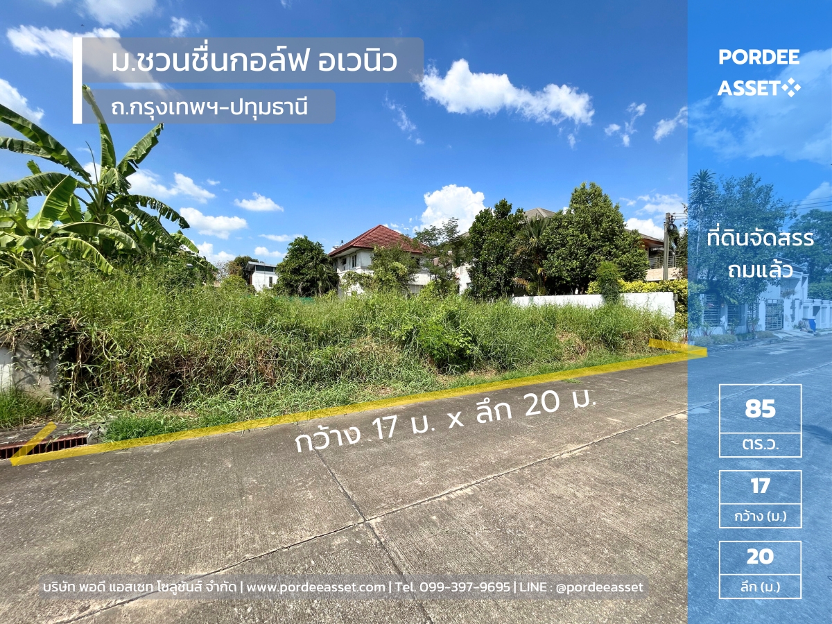 ที่ดินจัดสรรถมแล้ว 85 ตร.ว. ม.ชวนชื่นกอล์ฟ อเวนิว กรุงเทพฯ-ปทุมธานี ติดสนามกอล์ฟ Flora Ville Golf & Country Club ใกล้แยกบางคูวัด โรบินสันศรีสมาน เมืองทองธานี ปทุมธานี