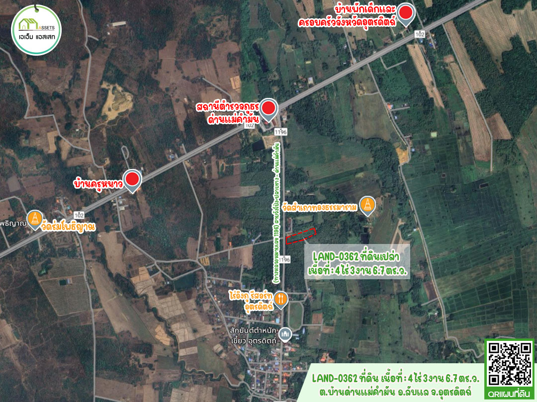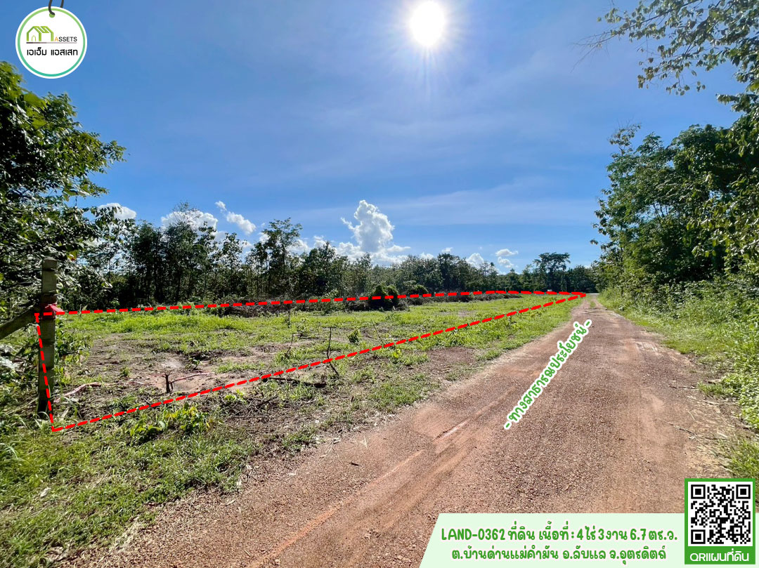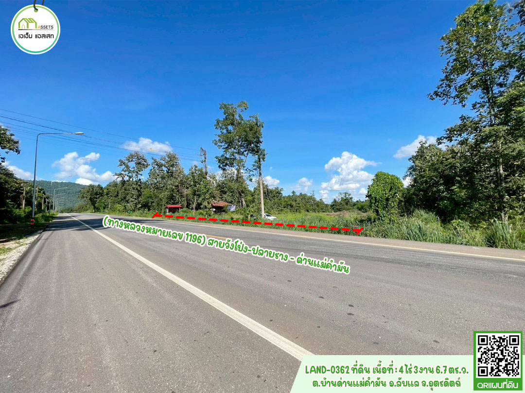 # รหัสทรัพย์ : LAND–0362 ที่ดินเปล่า # เนื้อที่ : 4 ไร่ 3 งาน 6.7 ตารางวา #ที่ตั้ง : ต.บ้านด่านแม่คำมัน อ.ลับแล จ.อุตรดิตถ์ #รายละเอียด : ที่ดินรูปแปลงสวยๆ เนื้อที่เยอะ ติดทางสาธารณประโยชน์ 2 ด้าน ด้านหน้าติดถนนหมายเลข 1196 (สายวังโป่ง-ปลายราง-ด่านมแม่คำมัน) ใกล้กับสถานีตำรวจภูธรด่านแม่คำมัน,สำนักงานขนส่งจังหวัดอุตรดิตถ์,ปั๊มน้ำมัน,ร้านค้า,ร้านอาหาร,คาเฟ่ อื่นๆ รอบๆบริเวณมีเพื่อนบ้าน ไม่เปลี่ยว พร้อมสาธารณูปโภคต่างๆ เหมาะสำหรับสร้างบ้านพักอาศัย บ้านสวนเกษตร ทำเกษตรกรรม หรือซื้อเก็บไว้ในอนาคตก็ดีครับแปลงนี้ เอกสารสิทธิ์โฉนดครุฑแดงพร้อมโอน ราคาพิเศษมากๆ ติดสินใจซื้อช่วงเวลานี้คุ้มมากๆครับ #สถานะที่ดิน : ว่าง #ราคา : 1,500,000 บาท [พร้อมโอน]