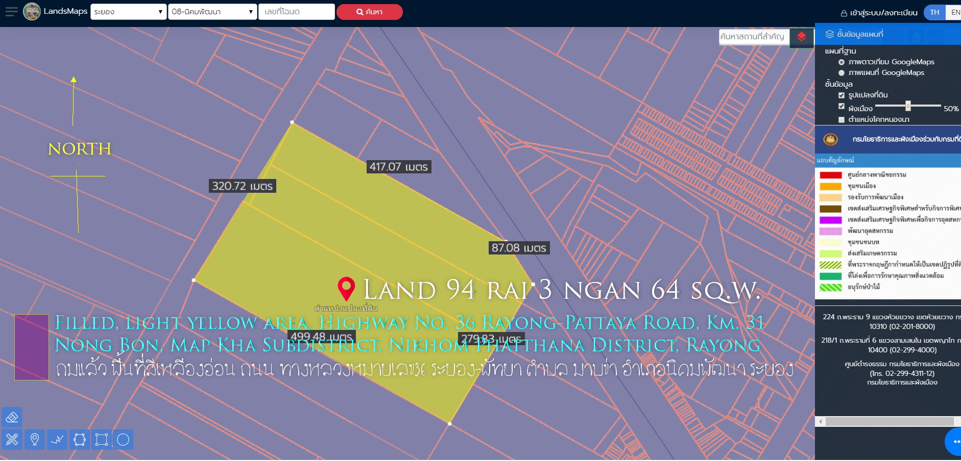 ที่ดิน94ไร่3งาน64ตรว. ถมแล้ว พื้นที่สีเหลืองอ่อน หน้ากว้าง 85ม. ถนน ทางหลวงหมายเลข36 ระยอง-พัทยา กม.31 หนองบอน ตำบล มาบข่า อำเภอนิคมพัฒนา ระยอง
