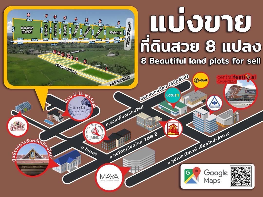 พลาดไม่ได้! ที่ดินถมแล้ว วิวภูเขาและวิวทุ่งนาสวย อ.เมือง เชียงใหม่ ใกล้ Central Festival 15 นาที ขายราคาต่ำกว่าตลาด https://youtu.be/qZvg7eYfZ0Q ขายเพียงตารางวาละ 14,000 บาท บาท บริเวณข้างเคียงขาย 22,000-28,000 บาท/ตร.ว รายละเอียด -เอกสารสิทธิ์โฉนด เห็นวิวทุ่งนาและวิวภูเขาสวยทุกแปลง โดยสร้างบ้านหันไปทางทิศใต้ ฮวงจุ้ยดี รับลม -มีทั้งหมด 8 แปลง ถนนกว้าง 6 เมตร แปลงที่ 1 เนื้อที่ 200 ตารางวา 3,000,000 บาท ติดถนนสองด้านเป็นแปลงเดียวที่ราคา 15,000/ตร.ว สร้างบ้านหันทางทิศทิศใต้หรือตะวันออกก็ได้ ทำเลค้าขายได้ ห่างถนนเลี่ยงเมือง 190 เมตร (SOLD) แปลงที่ื 2-8 ราคา 14,000 บาท/ตร.ว แปลงที่ 2 เนื้อที่ 150 ตารางวา 2,100,000 บาท แปลงที่ 3 เนื้อที่ 150 ตารางวา 2,100,000 บาท แปลงที่ 4 เนื้อที่ 150 ตารางวา 2,100,000 บาท แปลงที่ 5 เนื้อที่ 150 ตารางวา 2,100,000 บาท แปลงที่ 6 เนื้อที่ 150 ตารางวา 2,100,000 บาท แปลงที่ 7 เนื้อที่ 150 ตารางวา 2,100,000 บาท แปลงที่ 8 เนื้อที่ 493 ตารางวา 6,902,000 บาท กรณีซื้อยกแปลง จะขายแปลงที่ 1 ให้ด้วย และมีส่วนลดพิเศษสุด รวมเนื้อที่หลังจากรังวัด 4-3-17 ไร่ - เทศบาลกำลังทำถนนคอนกรีตหน้าที่ดิน และขยายถนนกว้าง 6 เมตร - ที่ดินทำเลดีมีอนาคต บริเวณตรงข้ามของที่ดินเป็นทุ่งนา ห่างไปประมาณ 190 เมตร จะมีถนนเลี่ยงเมืองแม่ริม-> วงแกวนรอบสาม-> วงแหวนรอบสองตัดผ่าน - บริเวณใกล้เคียงมีร้านอาหาร ร้านกาแฟ ฟาร์มดอกไม้ และสวนน้ำเหมืองแก้ว - เหมาะกับการปลูกบ้านหรู พูลวิลลา ปลูกบ้านสวน ซื้อเพื่อเก็งกำไร ทำร้านอาหารร้านกาแฟ รีสอร์ต - ห่างจากถนนหลักวงแหวนรอบสามเพียง 1.5 กม. เข้าออกได้หลายทาง ** ได้รับมอบหมายให้ดำเนินการเสนอขาย ยินดีร่วมงานกับทุกท่าน ** ใกล้ Baan 5 Rai Pool Villa 2 นาที (500 ม.) สวนน้ำเหมืองแก้ว 8 นาที (3.7 กม.) ใกล้สวนดอกไม้ป้านกเอี้ยง 10 นาที (6.3 กม.) ใกล้โรงเรียนนานาชาติNIS 10 นาที (5 กม.) ใกล้ตลาดรวมโชค 10 นาที (7.8 กม.) ใกล้ศูนย์ราชการเชียงใหม่ 12 นาที (7.6 กม.) ใกล้Central Festival 15 นาที (12 กม.) ใกล้ MAYA Lifestyle Shopping Center 17 นาที (12 กม.) ใกล้สนามบินเชียงใหม่ 25 นาที (18 กม.) **พิกัด: ตำบลสันผีเสื้อ อำเภอเมือง เชียงใหม่ https://maps.app.goo.gl/YiLyRgeDcqW6nsYw6?g_st=il Land for sale with mountain and beautiful rice field views, near Central Festival Chiang Mai 15 minutes. Selling for only 14,000-15,000 baht per square wa. Nearby area for sale 18,000-22,000 baht/sq wa. Details - Title deed document, See views of rice fields and beautiful mountain views in every plot. By building a house facing south, good feng shui, catches the wind. -There are 8 plots in total, roads are 6 meters wide. Plot 1, area 200 square meters (SOLD) Adjacent to the road on two sides. You can build a house facing south or east. Plot 2-8 price 14,000 baht/sq m. Plot 2, area 150 square meters, 2,100,000 baht Plot 3, area 150 square meters, 2,100,000 baht Plot 4, area 150 square meters, 2,100,000 baht Plot 5, area 150 square meters, 2,100,000 baht Plot 6, area 150 square meters, 2,100,000 baht Plot 7, area 150 square meters, 2,100,000 baht Plot 8, area 493 square meters, 6,902,000 baht -Width next to the public way 26.5 meters If you purchase the entire plot, we will also sell the first plot, with a special discount. The total land area after surveying is 4-3-17 rai. - The land is in a good location on a future. Opposite the land is a rice field. About 190 meters away, there is a Mae Rim bypass road -> the third ring road -> the second ring road cutting through. - The municipality is constructing a concrete road in front of the land and widening it to 6 meters wide which will be completed around 2025. - Water, elect
