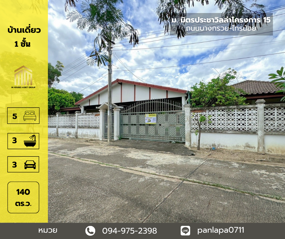 ลดราคาถูกมาก บ้านเดี่ยวชั้นเดียว (140 ตร.ว.) หมู่บ้านมิตรประชาวิลล่าโครงการ 15 บางบัวทอง ถนนบางกรวย-ไทรน้อย นนทบุรี เหมาะกับครอบครัวขนาดใหญ่