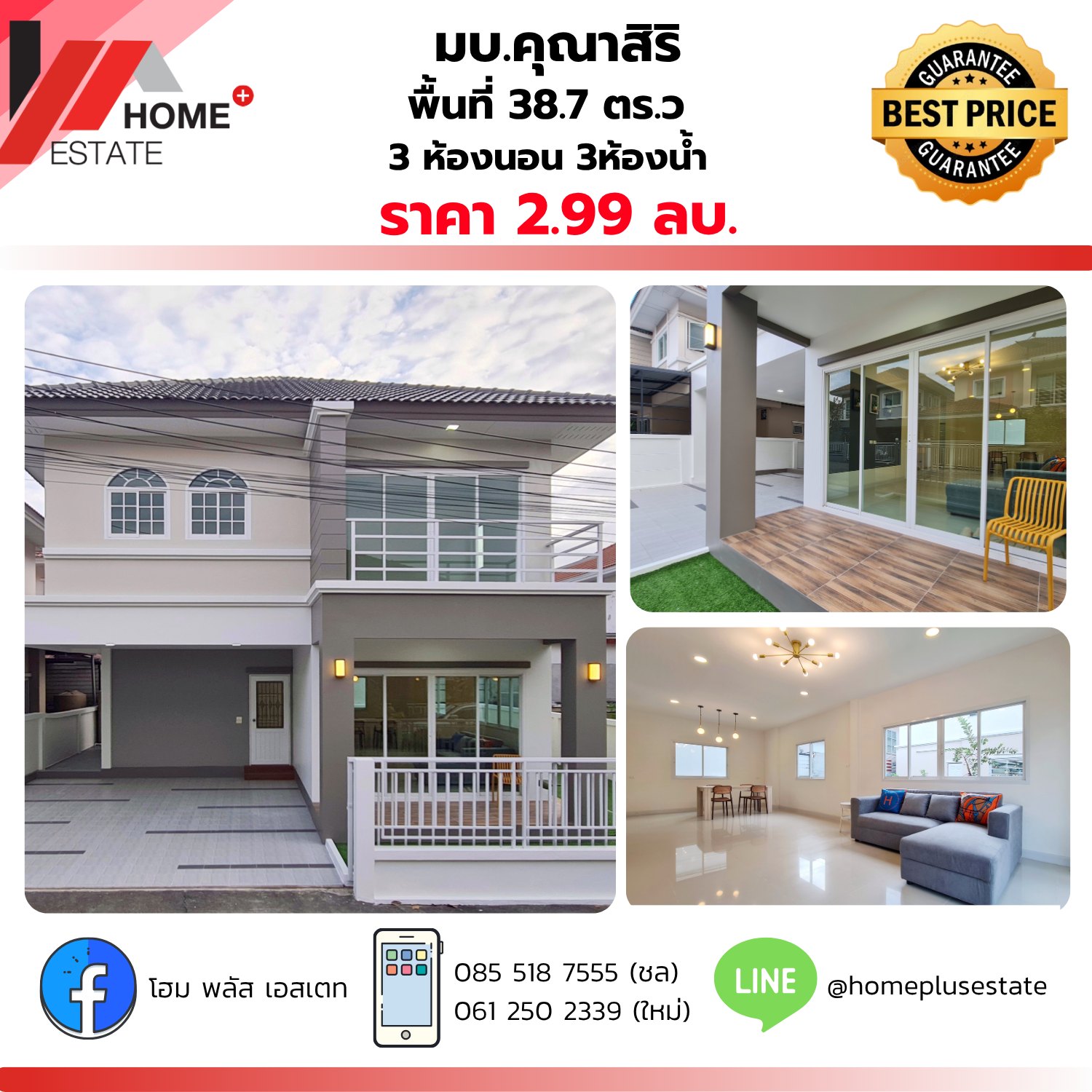 ม.คุณาสิริ (บางบัวทอง) ทำเลดี ใกล้รถไฟฟ้าสายสีม่วง-เซ็นทรัลเวสท์เกต ที่สำคัญ... ไม่มีค่าส่วนกลาง!! ฟังก์ชันครบ ตอบโจทย์ครอบครัว 3 ห้องนอน 3 ห้องน้ำ 2 ที่จอดรถ รายละเอียดบ้าน: เนื้อที่ 38.7 ตร.ว. พื้นที่ใช้สอยประมาณ 125 ตรม. บ้านสวย ตกแต่งดี พร้อมเข้าอยู่ หน้าบ้านหัน "ทิศเหนือ" ร่มเย็น ไม่ร้อนบ่าย อายุบ้าน 12 ปี (โครงสร้างแข็งแรง) พิเศษ 2.99 ล้านบาท จุดเด่นทำเล: ใกล้แนวรถไฟฟ้าสายสีม่วง ใกล้เซ็นทรัลเวสท์เกต ใกล้โฮมโปร บางบัวทอง พิกัดหมู่บ้านคุณาสิริ:https://maps.app.goo.gl/hEHG5XSkaUmfcRQx5สนใจติดต่อ สนใจนัดชมบ้าน หรือปรึกษาสินเชื่อ ติดต่อ คุณชล: 085-518-7555 คุณใหม่: 061-250-2339 Line ID: Chol6556