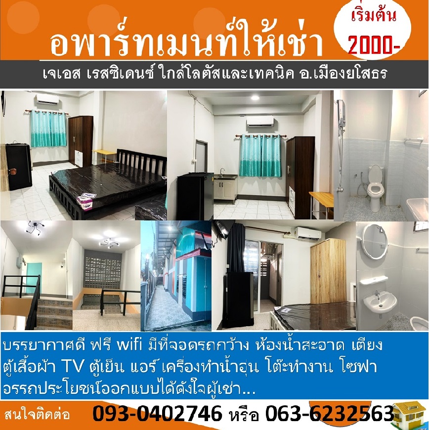 อพาร์ทเมนท์ให้เช่า เจเอส เรสซิเดนซ์ ใกล้โลตัส วิทยาลัยเทคนิค ศูนย์ราชการจังหวัด อ.เมืองยโสธร เฟอร์นิเจอร์พร้อมเครื่องใช้ไฟฟ้า ราคาเริ่มต้นเพียง 2000 บาท