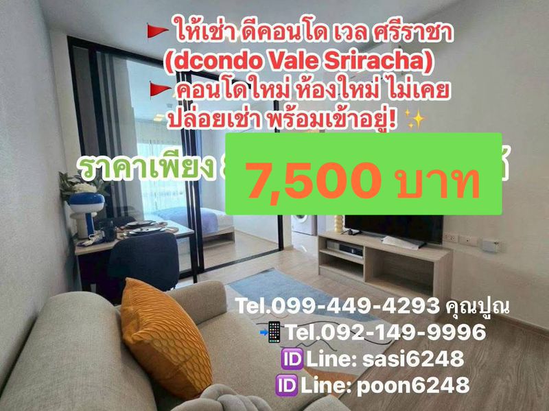 #ให้เช่า ดีคอนโด เวล ศรีราชา (dcondo Vale Sriracha) คอนโดใหม่ ห้องใหม่ ไม่เคยปล่อยเช่า พร้อมเข้าอยู่! ราคาเพียง 7,500 บาท/เดือน ขนาด 25.5 ตร.ม. ตึกบี *มีหลายห้อง* ชั้น3 ชั่น 5 ชั้น8 ตึก A/B วิวภูเขา,สระว่ายน้ำ,วิวทะเล อุปกรณ์เฟอร์ครบ เตียง ที่นอน ชุดผ้าปู แอร์ 2เครื่อง ทีวี ตู้เย็น ไมโคเวฟ เครืองซักผ้า เครื่องทำน้ำอุ่น โต๊ะอาหาร โซฟา ตู้เสื้อผ้า โต๊ะเครื่องแป้ง เงื่อนไขการเช่า ประกันแรกเข้า 2 เดือน ค่าเช่าล่วงหน้า 1 เดือน สัญญาขั้นต่ำ 1 ปี เฟอร์นิเจอร์ตามรูป ติด ม.เกษตร ศรีราชา รีบจองก่อนพลาดห้องสวยในทำเลดี! =========== For more information, please contact ============== สนใจติดต่อ&ข้อมูลเพิ่มเติม โทรสายตรง รับสายเอง24ชม. Tel.099-449-4293 คุณปูณ Tel.092-149-9996 Line: sasi6248 Line: poon6248 #EasyRichProperty Byคุณปูณ #รับฝากขาย/ #รับฝากเช่าอสังหาริมทรัพย์ #บ้านที่ดิน #คอนโด #ปิดเคสไว #บริการจริงใจ #ใส่ใจทุกเคส #คอนโดอ่าวอุดม #คอนโดศรีราชา #บ้านเช่าศรีราชา #ขายบ้านศรีราชา#บ้านเช่าพัทยา #คอนโดเช่าพัทยา #บ้านเช่าชลบุรี #ขายบ้านพัทยา #ขายบ้านชลบุรี#อสังหาริมทรัพย์ #คอนโดเช่าพัทยา #บ้านเช่าชลบุรี #ขายบ้านพัทยา #ขายบ้านชลบุรี#อสังหาริมทรัพย์