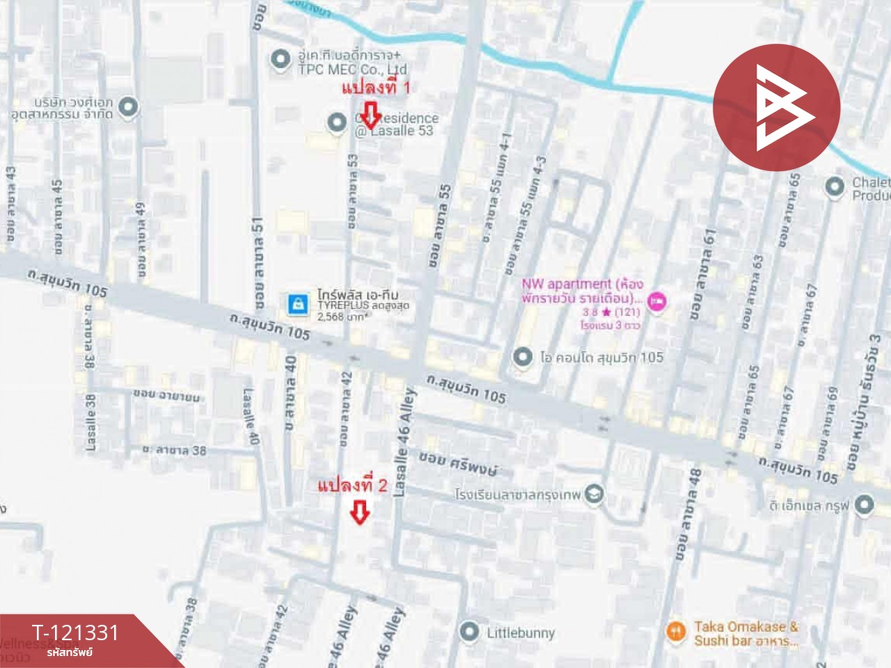 ที่ดิน : พระโขนง กรุงเทพมหานคร ที่ตั้ง : ซ. ลาซาล แขวงบางจาก เขตพระโขนง กรุงเทพมหานคร รหัสทรัพย์ : T-121331 ประเภท : ที่ดิน เนื้อที่ : 1 ไร่ 68.0 ตารางวา รายละเอียดเพิ่มเติม : แปลงที่ 1 - อยู่ในซอยลาซาล 53 เนื้อที่ 275 ตารางวา - หน้ากว้าง 20 เมตร ถมดินสูงกว่าถนน - อยู่ตรงข้ามกับ CJ Residence และเยื้องกับสนามแบดมินตัน ลาซาลสปอร์ตเฮาส์ แปลงที่ 2 - อยู่ในซอยลาซาล 42 เนื้อที่ 193 ตารางวา (ซอย 42 และ 53 จะตรงข้ามกันอยู่คนละฝั่งของถนนสุขุมวิท 105) - หน้ากว้าง 20 เมตร ลึก 40 เมตร ถมดินเสมอถนน - อยู่ใกล้กับสนามเทนนิส สปินนิ่ง เจ (Spinning J) - ให้เช่าราคา 20,000 บาทต่อเดือน ราคาเช่า : 50,000 บาท/เดือน ลิงค์แผนที่ : https://maps.google.com/?q=13.65802987,100.62915327 **เรามีบริการจัดสินเชื่อให้ฟรี พร้อมยินดีให้คำปรึกษา มีให้เลือกทุกธนาคาร** **พร้อมอัตราดอกเบี้ยพิเศษ และ วงเงินสูงสุด 90-100% ของราคาประเมิน** สนใจสอบถามข้อมูลเพิ่มเติม หรือ นัดชมบ้านได้ที่ Tel : 0653944245 แนน (รหัสตัวแทน 7018) Line ID : 0653944245 Callcenter : 02-047-4282 สนใจดูทรัพย์อื่นๆ เพิ่มเติม มากกว่า 3,000 รายการ www.tb.co.th The Best Property Agent CO,.LTD. ผู้นำด้านธุรกิจนายหน้า ตัวแทนอสังหาริมทรัพย์ครบวงจร ด้วยความเป็นมืออาชีพ ใช้เทคโนโลยี และ นวัตกรรมที่สร้างสรรค์ เพื่อส่งมอบบริการที่ดีที่สุดเพื่อคุณ ให้บริการด้าน ซื้อ ขาย เช่า อสังหาริมทรัพย์