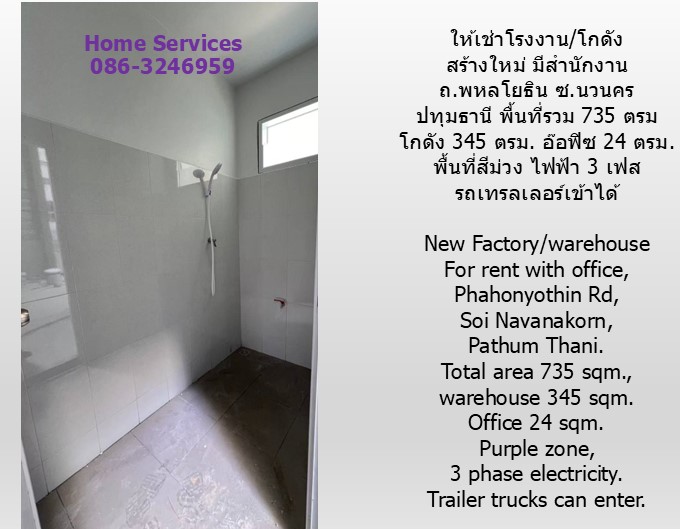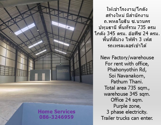 ให้เช่าโรงงาน/โกดัง สร้างใหม่ มีสำนักงาน ถ.พหลโยธิน ซ.นวนคร ปทุมธานี พื้นที่ 735 ตรม. โกดัง 345 ตรม. พื้นที่สีม่วง ไฟฟ้า 3 เฟส รถเทรลเลอร์เข้าได้ 1.ที่ตั้ง ซอยสามารถบิ๊กแลนด์ (ซอยนวนคร) ถนนพหลโยธิน ตำบลคลองหนึ่ง อำเภอคลองหลวง ปทุมธานี ใกล้ถนนพหลโยธิน ใกล้ : นิคมนวนคร 3 กม., ตลาดไท 5 กม., โรงพยาบาลนวนคร 1.2 กม. 2.พื้นที่ 184 ตรว.หรือ 735 ตรม. โกดัง 345 ตรม. 3. รายละเอียด : - โรงงาน/โกดัง สร้างใหม่ พร้อมสำนักงาน พื้นที่สีม่วง ขอรง. 4 ได้ โกดัง กว้าง 11.5 x 30 ม. โกดังสูง 9 ม., พื้นรับน้ำหนักได้ถึง 2 ตัน/ตรม., ไฟฟ้า 3 เฟส, รถเทรลเลอร์ เข้าออกสะดวก - สำนักงาน 24 ตรม. 4.8×5 ม., ห้องน้ำ 3 ห้อง ชาย 1 หญิง 2, ห้องเก็บของ 1 ห้อง, ห้องอาบน้ำ 1 ห้อง ถนนหน้าโครงการ กว้าง 16 ม. เหมาะสำหรับเป็นโรงงานผลิต, โกดัง/คลังสินค้า, ศูนย์กระจายสินค้า ค่าไฟฟ้ายูนิตละ 10 บาท ประปาจ่ายตามจริง กปน.ประเภทธุรกิจ 4. ราคาเช่า 70,000 บาท/เดือน สัญญา 3 ปี (เช่าระยะยาว 3 ต่อ 3) เงินประกัน 200,000 ล่วง หน้า 1 เดือน 5. ใกล้สิ่งอำนวยความสะดวกต่างๆ Home Services โทร & ไลน์ 086-3246959, 0982566079 Home Services : ที่ปรึกษาและตัวแทนขายอสังหาริมทรัพย์ - รับฝากขาย/รับจัดหาผู้เช่า บ้าน ทฮ. ตึกแถว office ร้านค้า ที่ดิน โกดัง โรงงาน อื่นๆ - ย่าน : กรุงเทพฯ ถ.วิภาวดี ปิ่นเกล้าและใกล้เคียง, นครปฐม พุทธมณฑล ศาลายา กาญจนาภิเษก บรมราชชนนี, นนทบุรี ราชพฤกษ์ นครอินทร์ บางบัวทอง ปทุมธานี เป็นต้น - ทุกราคา New Factory/warehouse for rent with office, Phahonyothin Rd, Soi Navanakorn, Pathum Thani. 735 sqm., warehouse 345 sqm. Purple zone, 3 phase electricity. Trailer trucks can enter.
