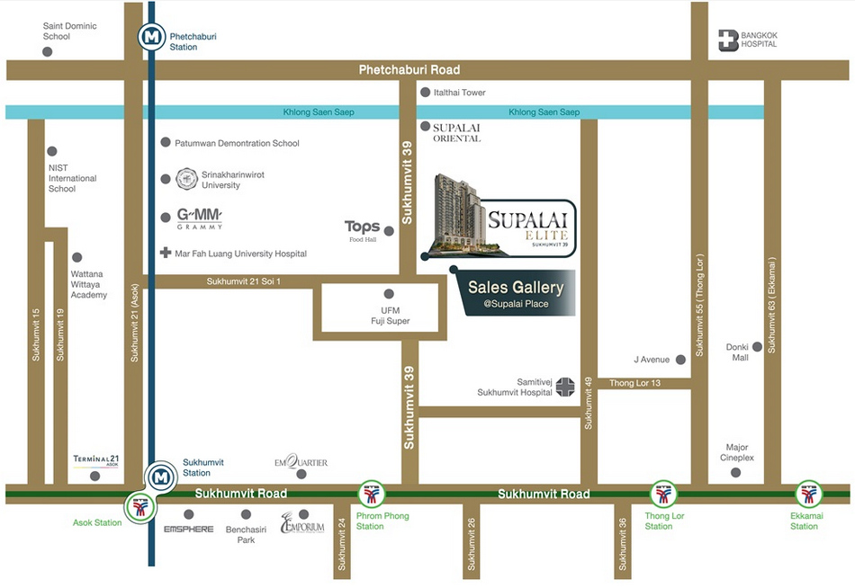 Supalai Elite Sukhumvit 39 is located in Sukhumvit Soi 39, a key soi off Sukhumvit Road, connecting to several major roads including Asoke Montri Road, Sukhumvit Road, Ekkamai-Thonglor, and Phetchaburi Road without having to go onto the main road. The project is situated near the Phetchaburi Road exit at Soi 38/1. The surrounding area offers complete amenities, with Tops Food Hall, Shinsen Fish Market, and UFM located directly across from the project. A short walk to TAKA Town.