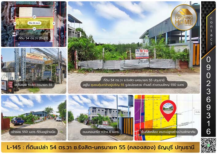 L-145 : ที่ดิน 54 ตร.วา ซ.รังสิต-นครนายก 55 (คลอง 2) ธัญบุรี ปทุมธานี