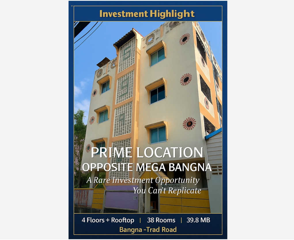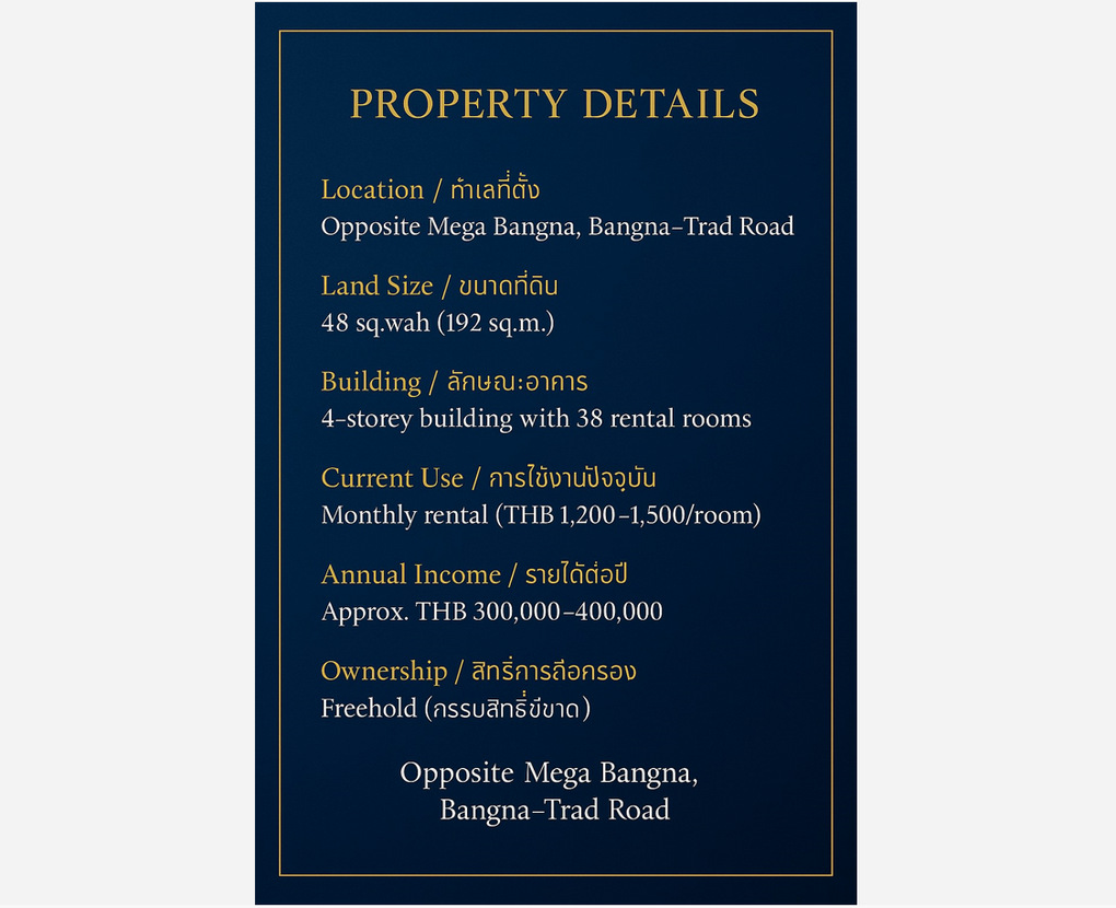 ตึก 4 ชั้น + Rooftop , 38 ห้อง บนที่ดิน 48 ตารางวา ติดถนนบางนา-ตราด กม.8 . เจ้าของขอส่งต่อ ให้กับนักลงทุนที่มองทำเลแห่งศักยภาพระยะยาว Rare Asset • 38 ห้อง . 39.8 ล้านบาท . ทรัพย์ประเภทนี้ไม่ได้พบในตลาดบ่อย และย่านบางนาอยู่ในเส้นทางเติบโตจริง ทั้ง Mega City, ออฟฟิศ, แหล่งงาน,สถาบันการศึกษา,โลจิสติกส์ และโครงสร้างพื้นฐานใหม่ . รวมถึงรถไฟฟ้าบางนา-สุวรรณภูมิ ที่จะผ่านหน้าอาคารโดยตรง มูลค่าทรัพย์สินพร้อมพุ่งขึ้นแบบทวีคูณ . เหมาะสำหรับผู้ลงทุนที่ต้องการถือครองสินทรัพย์ที่ “มีคุณค่าต่อการถือยาว” พร้อมพัฒนาเพื่อต่อยอดได้หลายรูปแบบ เช่น Service Apartment / Budget Hotel / Air BNB . สนใจรายละเอียดเพิ่มเติม หรือนัดชมสถานที่ ได้ทุกวันค่ะ . ที่ตั้ง : ถ.บางนา-ตราด กม.8 บางแก้ว บางพลี สมุทรปราการ 10540 GPS : https://maps.app.goo.gl/LbDisd5xJWht4yRXA . Contact คุณแมว Call : 091-723-2192 Line : 0917232192 Mail : jullajit@sunforson.com . ----------------------------------------------------------------- . . For Sell Apartment 4-storey, Prime location opposite Mega Bangna, Bangna-Trad Km.8 road . Land area : 48 sq.wah Rooms : 38 Building : 4-storey + rooftop . Asking price : THB 39.8 Million . Strategic Location : • Located right on Bangna–Trad Road, opposite Mega Bangna • Surrounded by major developments, condos, and commercial projects • The upcoming Monorail Line (Bangna Junction – Suvarnabhumi Airport) will pass directly in front of the property, dramatically increasing the long-term land value . Investment Highlights: • Currently operating as a rental apartment with stable monthly income • Ideal for conversion into a Service Apartment, Budget Hotel, or Co-Living Project • Strong structural foundation, ready for renovation or redevelopment . Location : Bangna-Trad Km.8 road, Bang Kaeo, Bang Phli, Samut Prakan 10540 GPS : https://maps.app.goo.gl/LbDisd5xJWht4yRXA . If you are interested, please contact : Khun Maew Call : 091-723-2192 Line : 0917232192 Mail : jullajit@sunforson.com . ------------------------------------------------------------------- . . บริการโพสต์อสังหา ขาย-เช่า ทรัพย์ทุกประเภท ผ่านเว็บชั้นนำ ติดอันดับ Top Google สูงสุด http://www.yongservice.com . . .