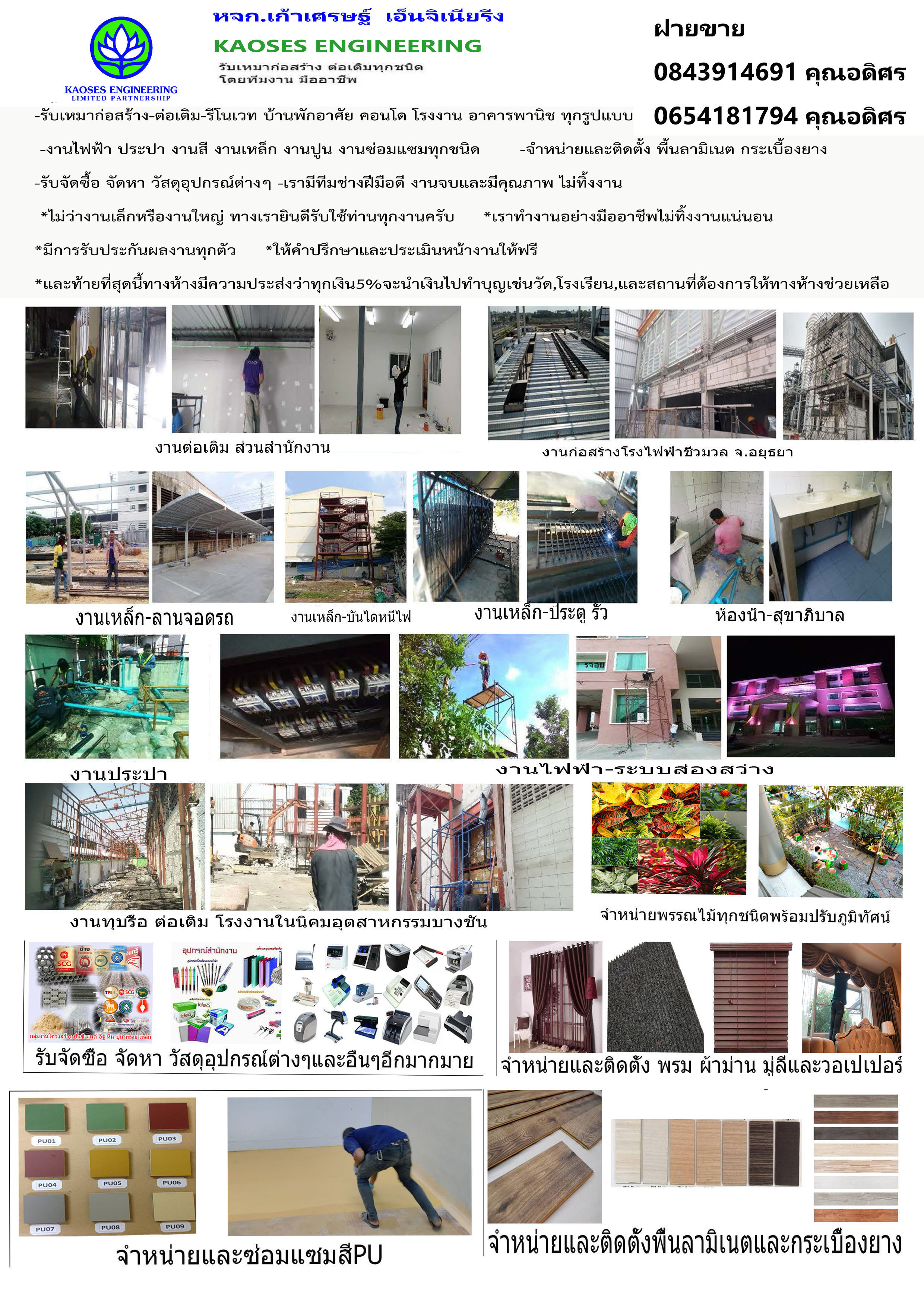 หจก.เก้าเศรษฐ์ เอ็นจิเนียริ่ง KAOSES ENGINEERING LIMITED PARTNERSHIP -รับเหมาก่อสร้าง-ต่อเติม-รีโนเวท บ้านพักอาศัย คอนโด โรงงาน อาคารพานิช ทุกรูปแบบ -งานไฟฟ้า ประปา งานสี งานเหล็ก งานปูน งานซ่อมแซมทุกชนิด -รับจัดซื้อ จัดหา วัสดุอุปกรณ์ต่างๆ -เรามีทีมช่างฝีมือดี งานจบและมีคุณภาพ ไม่ทิ้งงาน *ไม่ว่างานเล็กหรืองานใหญ่ ทางเรายินดีรับใช้ท่านทุกงานครับ *เราทำงานอย่างมืออาชีพไม่ทิ้งงานแน่นอน *มีการรับประกันผลงานทุกตัว *ให้คำปรึกษาและประเมินหน้างานให้ฟรี *และท้ายที่สุดนี้ทางห้างมีความประสงค์ว่าเงิน5%ที่ได้รับจากนายจ้างทุกท่านจะนำเงินไปทำบุญเช่นวัด,โรงเรียน,และสถานที่ต้องการให้ทางห้างช่วยเหลือ *ทางห้างหวังเป็นอย่างยิ่งจะได้เข้าไปรับใช้แล้วทางห้างจะทำงานด้วยความซื่อตรงและซื่อสัตย์ต่อนายจ้างทุกท่านครับ สนใจติดต่อ 0843914691,0654181794 คุณอดิศร